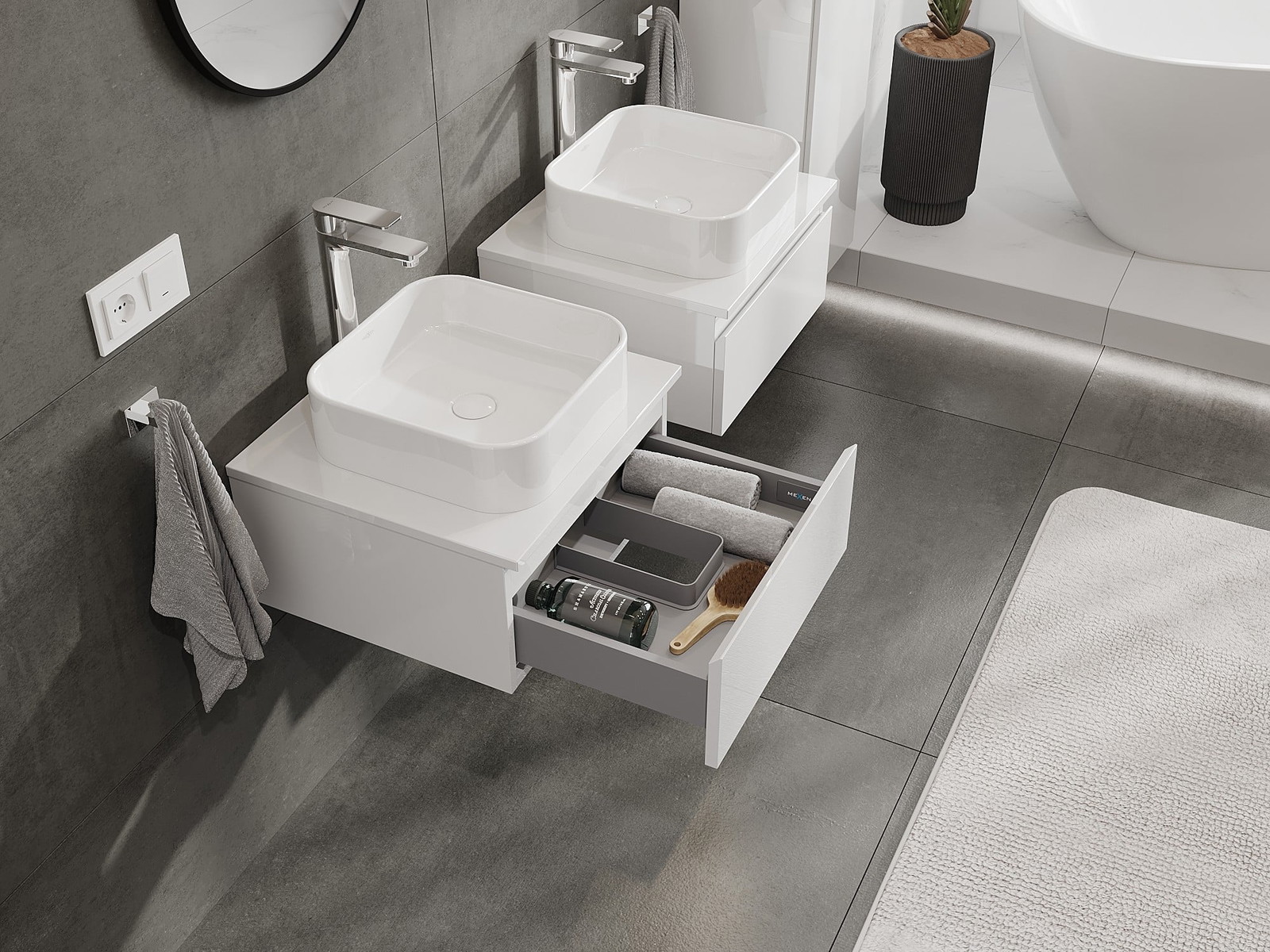 I nostri mobili da bagno modulari possono essere combinati tra loro in diverse configurazioni di colore, consentendo una personalizzazione completa. È possibile scegliere sia l'aspetto che le funzioni dei singoli elementi, permettendo di adattare i mobili alle proprie preferenze stilistiche e di utilizzo.