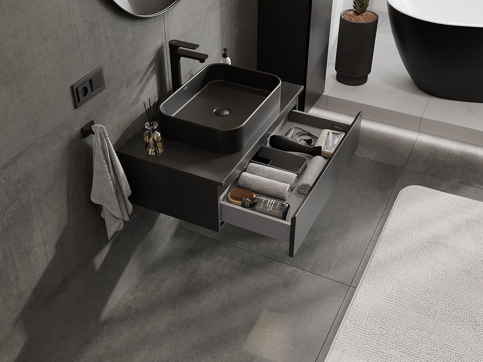 Il ritaglio nel cassetto è progettato in modo da ospitare il sifone, che è necessario nelle installazioni dei lavandini. Grazie a ciò, il mobile può essere montato in modo completamente funzionale, senza dover rinunciare allo spazio nel cassetto a favore dell'installazione.