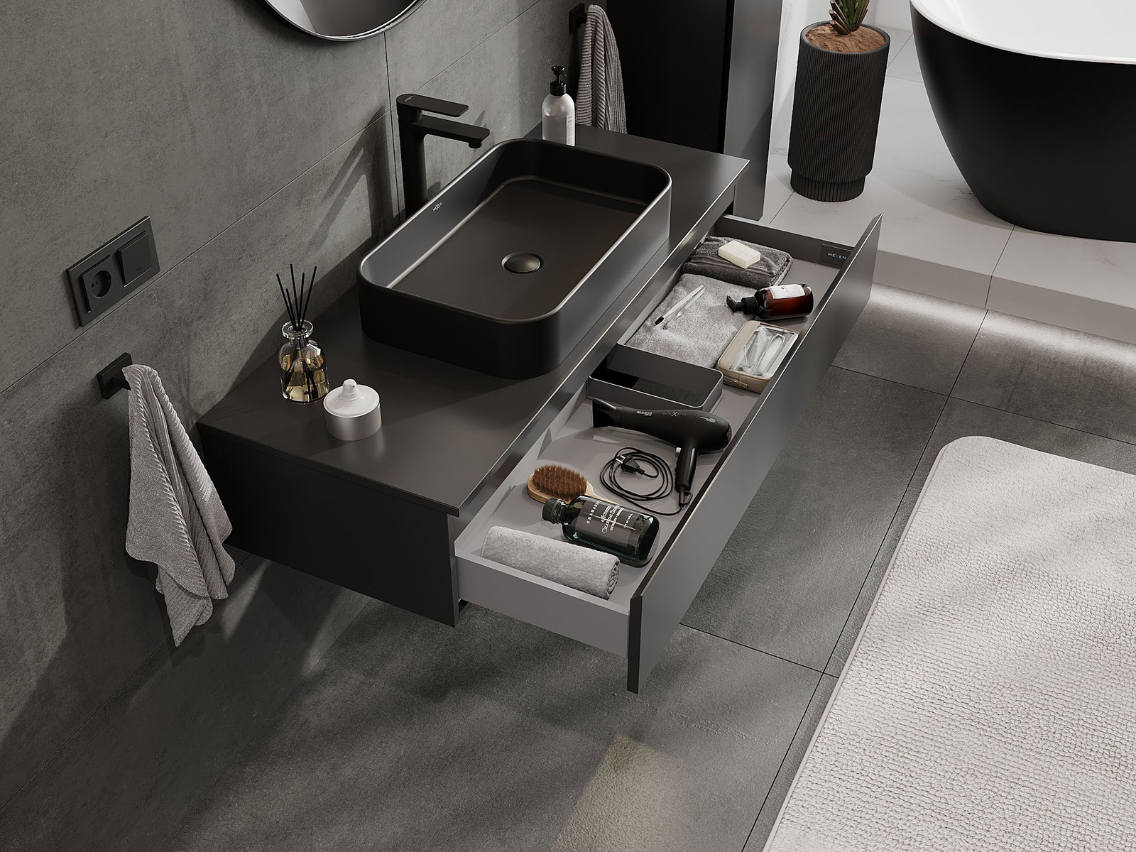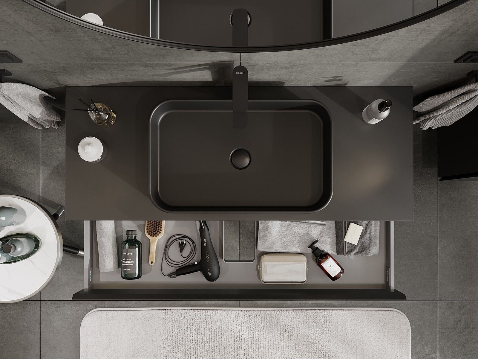 Il ritaglio nel cassetto è progettato in modo da ospitare il sifone, che è necessario nelle installazioni dei lavandini. Grazie a ciò, il mobile può essere montato in modo completamente funzionale, senza dover rinunciare allo spazio nel cassetto a favore dell'installazione.