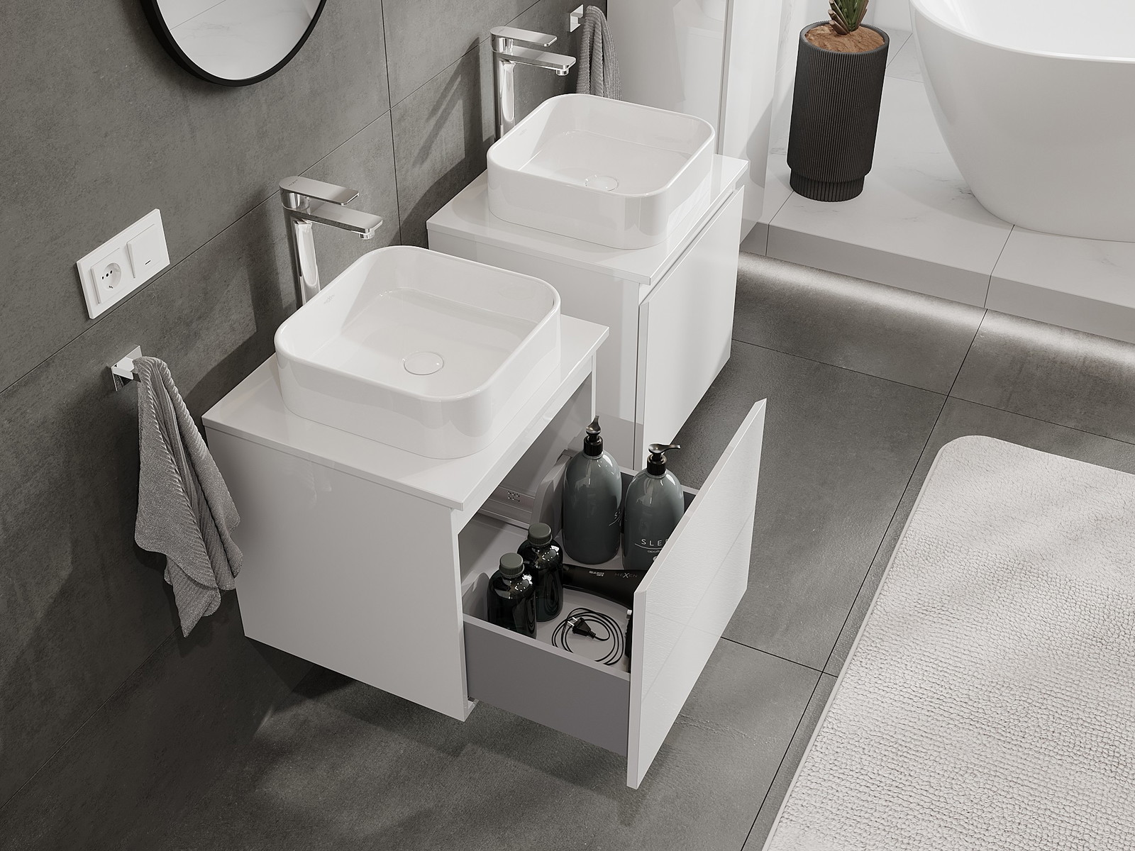 I nostri mobili da bagno modulari possono essere combinati tra loro in diverse configurazioni di colore, consentendo una personalizzazione completa. È possibile scegliere sia l'aspetto che le funzioni dei singoli elementi, permettendo di adattare i mobili alle proprie preferenze stilistiche e di utilizzo.
