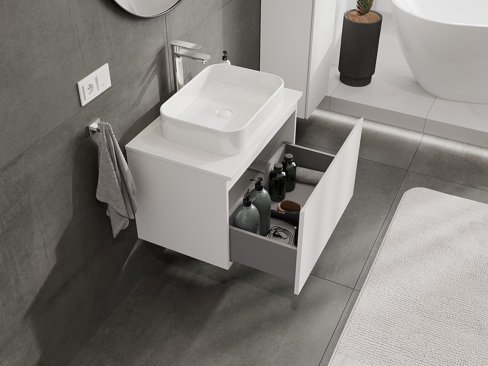 Il ritaglio nel cassetto è progettato in modo da ospitare il sifone, che è necessario nelle installazioni dei lavandini. Grazie a ciò, il mobile può essere montato in modo completamente funzionale, senza dover rinunciare allo spazio nel cassetto a favore dell'installazione.