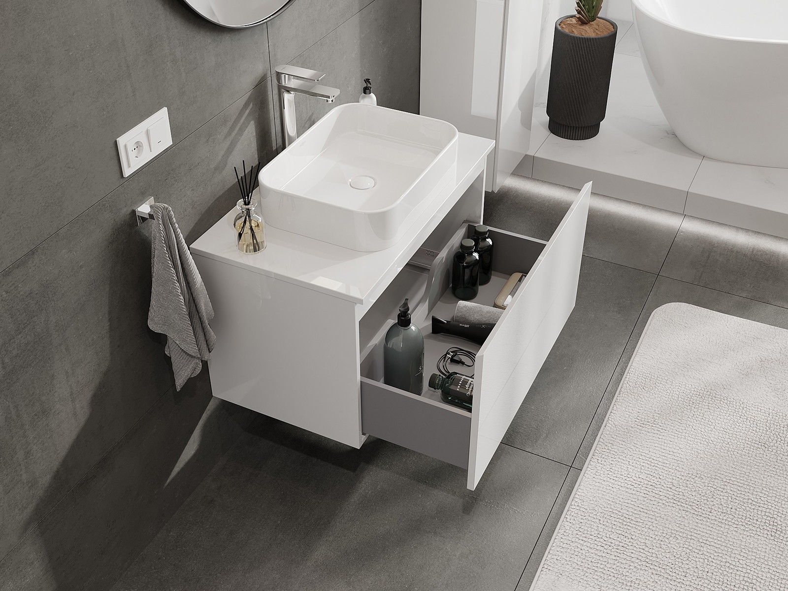 Il ritaglio nel cassetto è progettato in modo da ospitare il sifone, che è necessario nelle installazioni dei lavandini. Grazie a ciò, il mobile può essere montato in modo completamente funzionale, senza dover rinunciare allo spazio nel cassetto a favore dell'installazione.