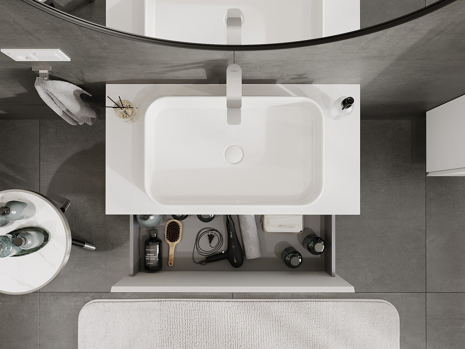 Il ritaglio nel cassetto è progettato in modo da ospitare il sifone, che è necessario nelle installazioni dei lavandini. Grazie a ciò, il mobile può essere montato in modo completamente funzionale, senza dover rinunciare allo spazio nel cassetto a favore dell'installazione.