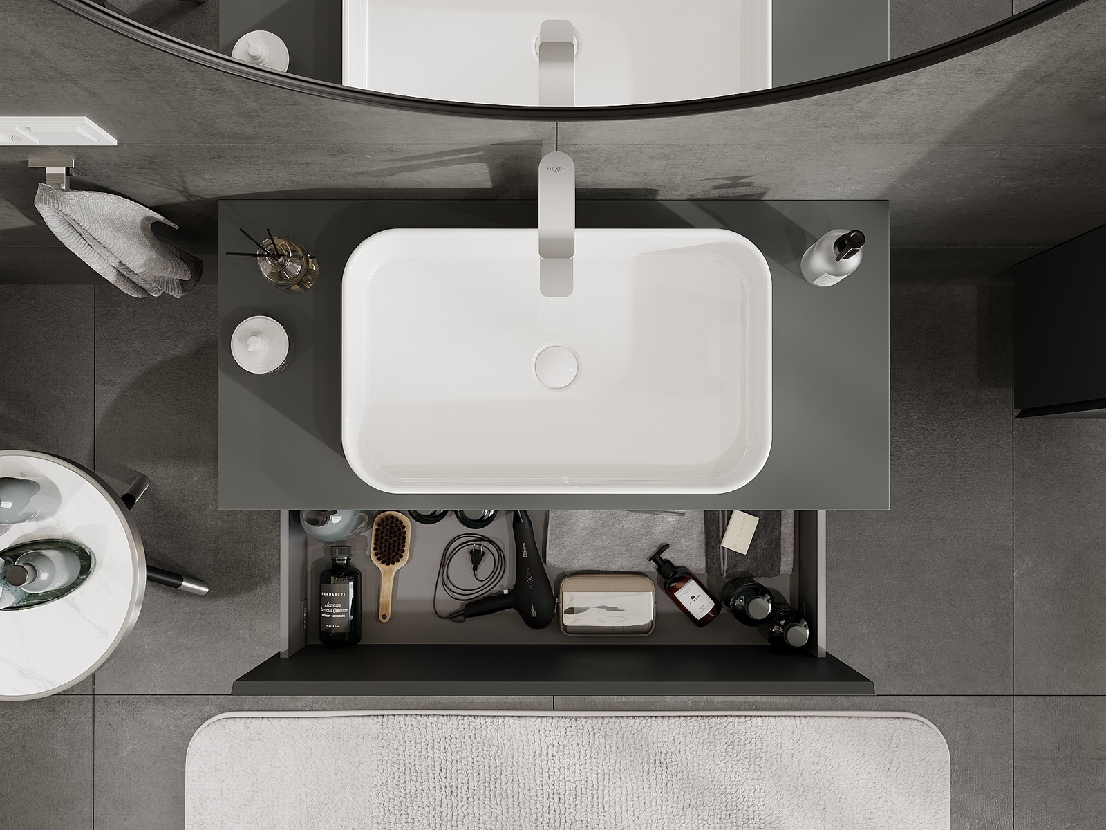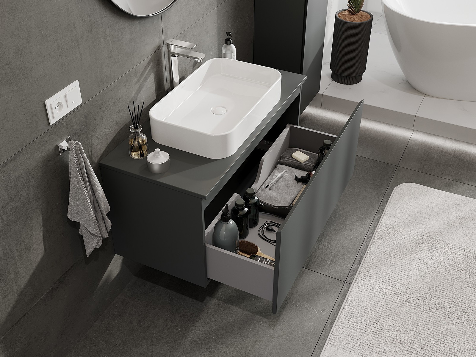 Il ritaglio nel cassetto è progettato in modo da ospitare il sifone, che è necessario nelle installazioni dei lavandini. Grazie a ciò, il mobile può essere montato in modo completamente funzionale, senza dover rinunciare allo spazio nel cassetto a favore dell'installazione.