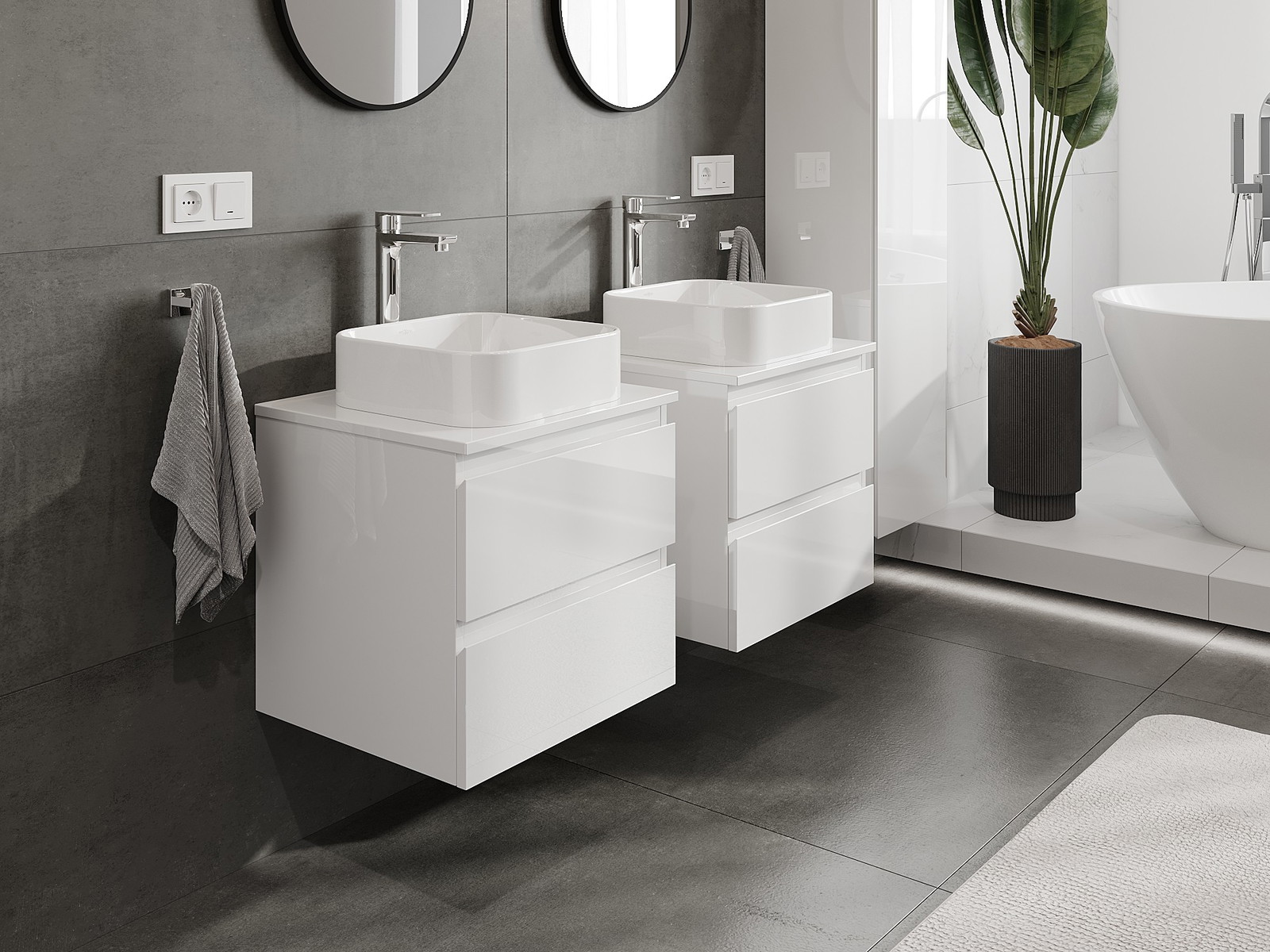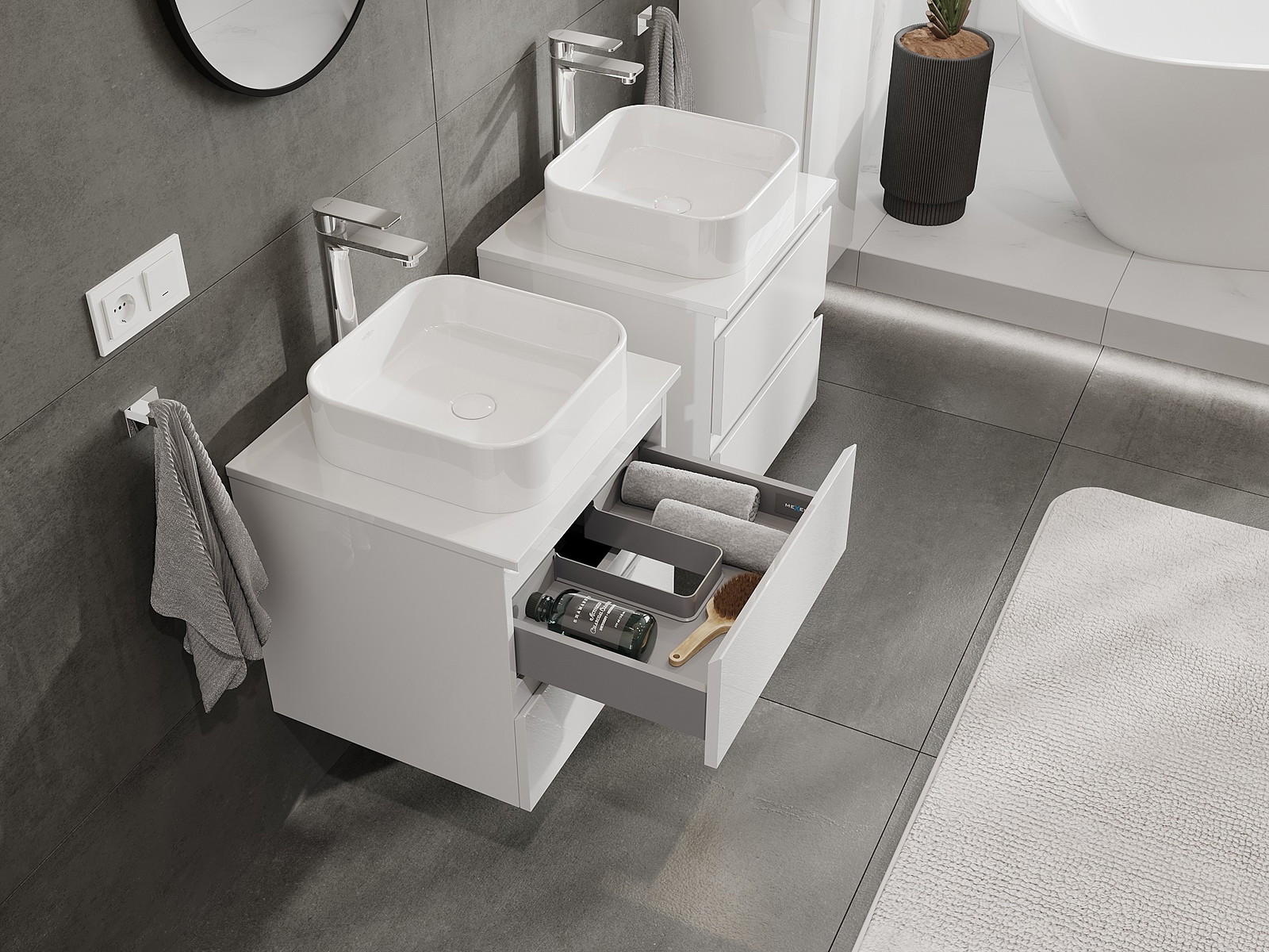 I nostri mobili da bagno modulari possono essere combinati tra loro in diverse configurazioni di colore, consentendo una personalizzazione completa. È possibile scegliere sia l'aspetto che le funzioni dei singoli elementi, permettendo di adattare i mobili alle proprie preferenze stilistiche e di utilizzo.