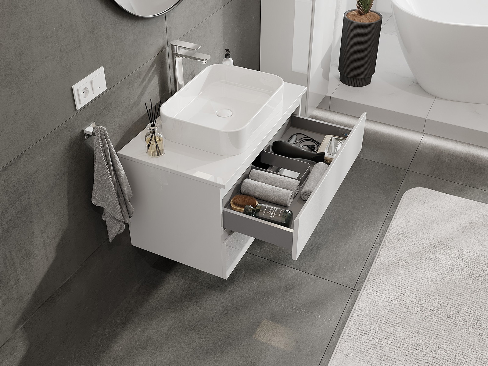 Il ritaglio nel cassetto è progettato in modo da ospitare il sifone, che è necessario nelle installazioni dei lavandini. Grazie a ciò, il mobile può essere montato in modo completamente funzionale, senza dover rinunciare allo spazio nel cassetto a favore dell'installazione.