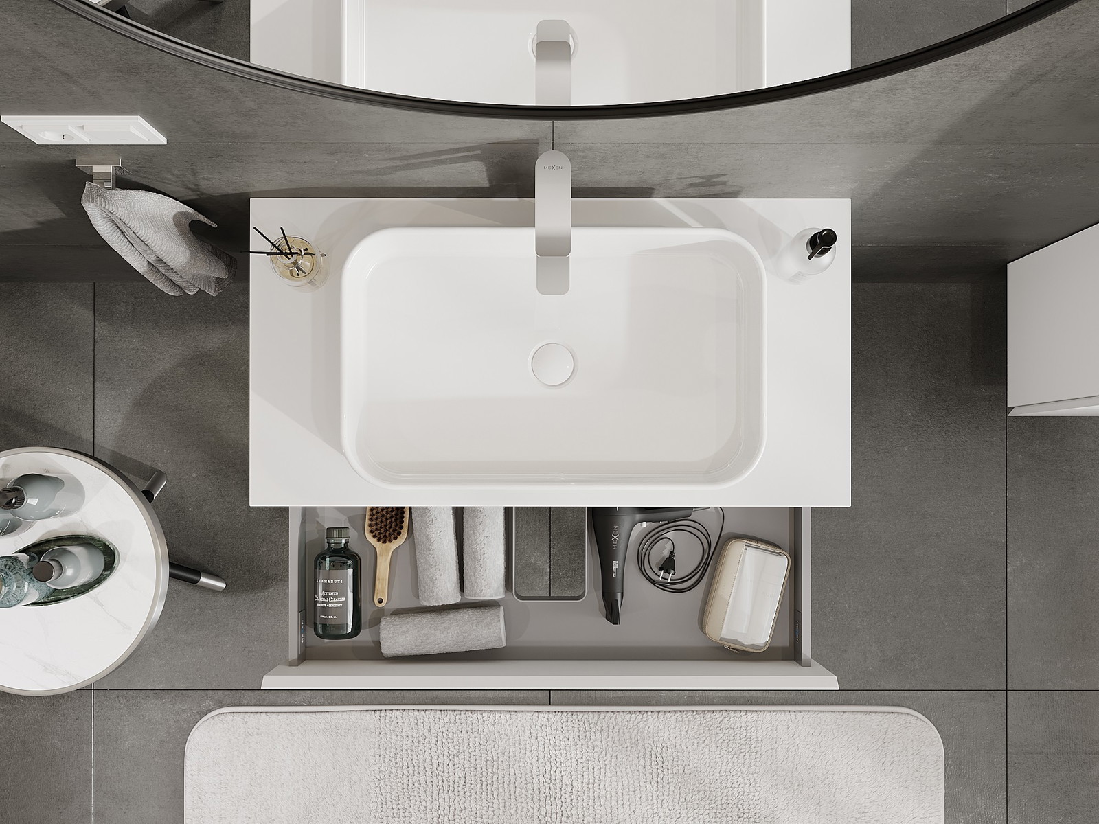 Il ritaglio nel cassetto è progettato in modo da ospitare il sifone, che è necessario nelle installazioni dei lavandini. Grazie a ciò, il mobile può essere montato in modo completamente funzionale, senza dover rinunciare allo spazio nel cassetto a favore dell'installazione.