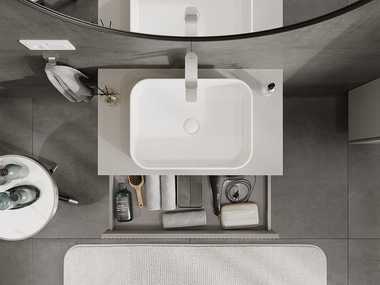 Il ritaglio nel cassetto è progettato in modo da ospitare il sifone, che è necessario nelle installazioni dei lavandini. Grazie a ciò, il mobile può essere montato in modo completamente funzionale, senza dover rinunciare allo spazio nel cassetto a favore dell'installazione.