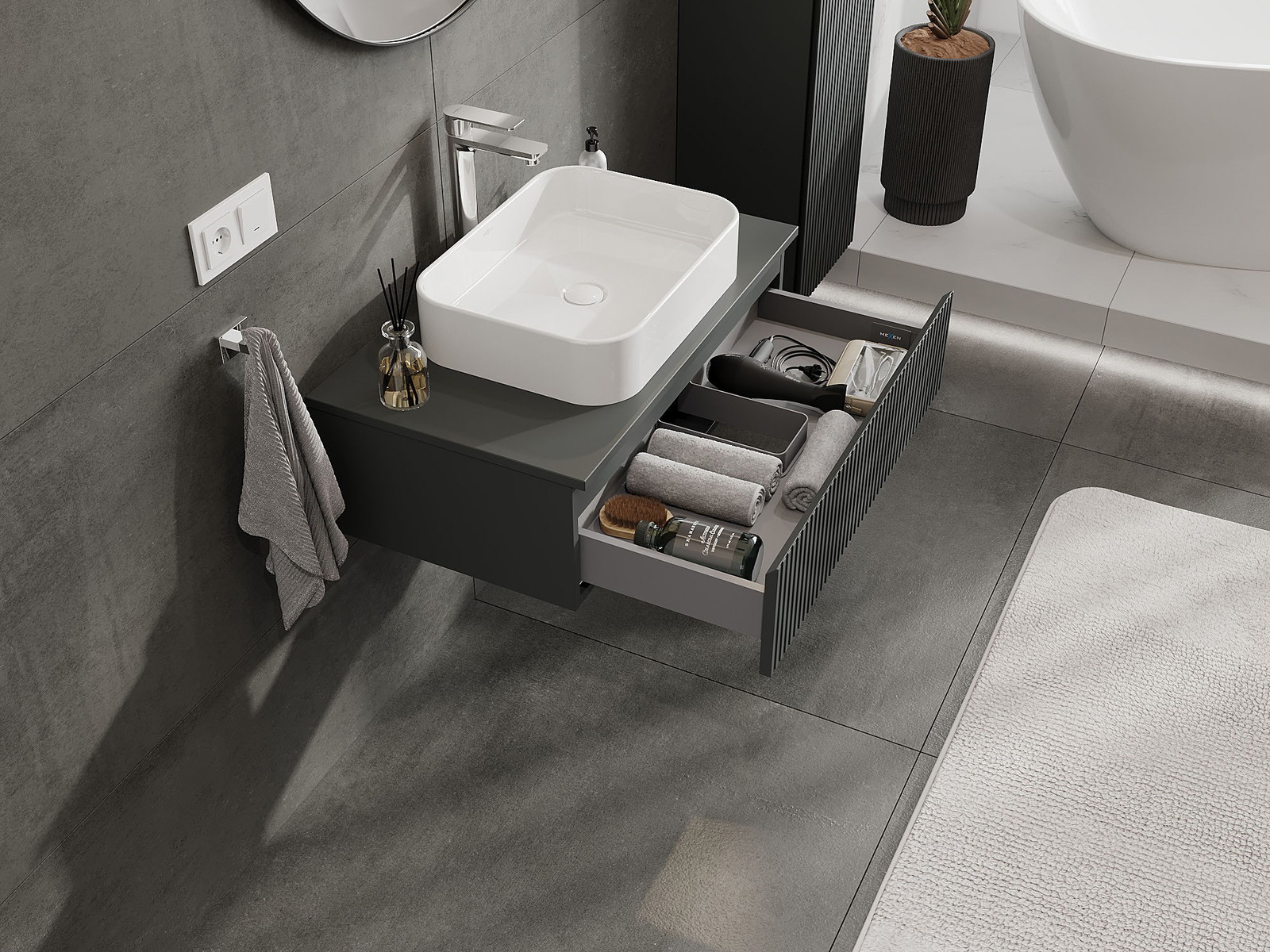 Il ritaglio nel cassetto è progettato in modo da ospitare il sifone, che è necessario nelle installazioni dei lavandini. Grazie a ciò, il mobile può essere montato in modo completamente funzionale, senza dover rinunciare allo spazio nel cassetto a favore dell'installazione.