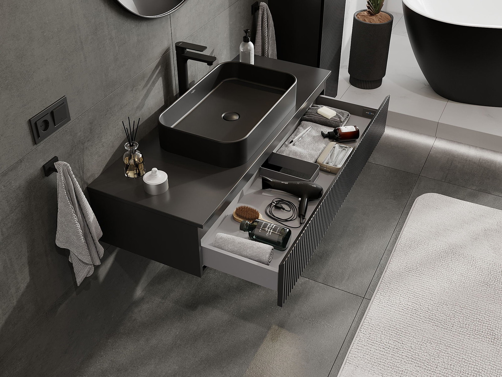 Il ritaglio nel cassetto è progettato in modo da ospitare il sifone, che è necessario nelle installazioni dei lavandini. Grazie a ciò, il mobile può essere montato in modo completamente funzionale, senza dover rinunciare allo spazio nel cassetto a favore dell'installazione.