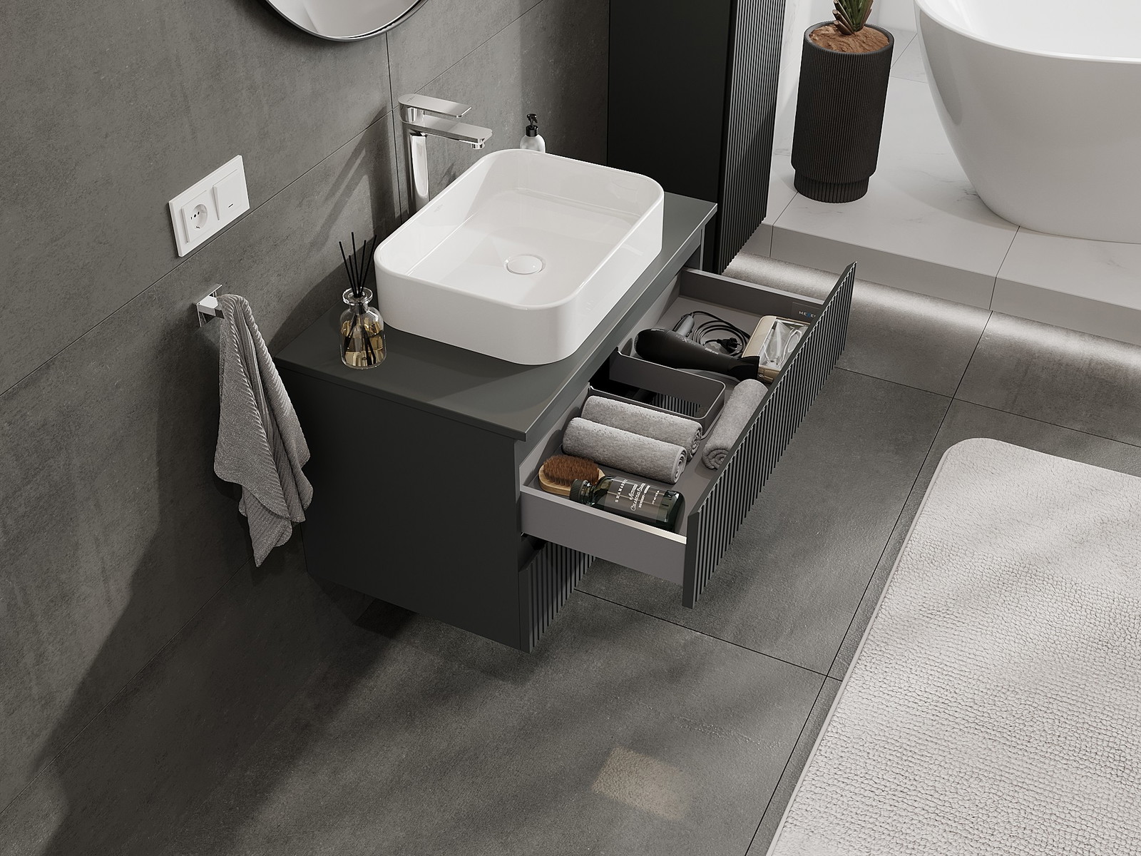 Il ritaglio nel cassetto è progettato in modo da ospitare il sifone, che è necessario nelle installazioni dei lavandini. Grazie a ciò, il mobile può essere montato in modo completamente funzionale, senza dover rinunciare allo spazio nel cassetto a favore dell'installazione.