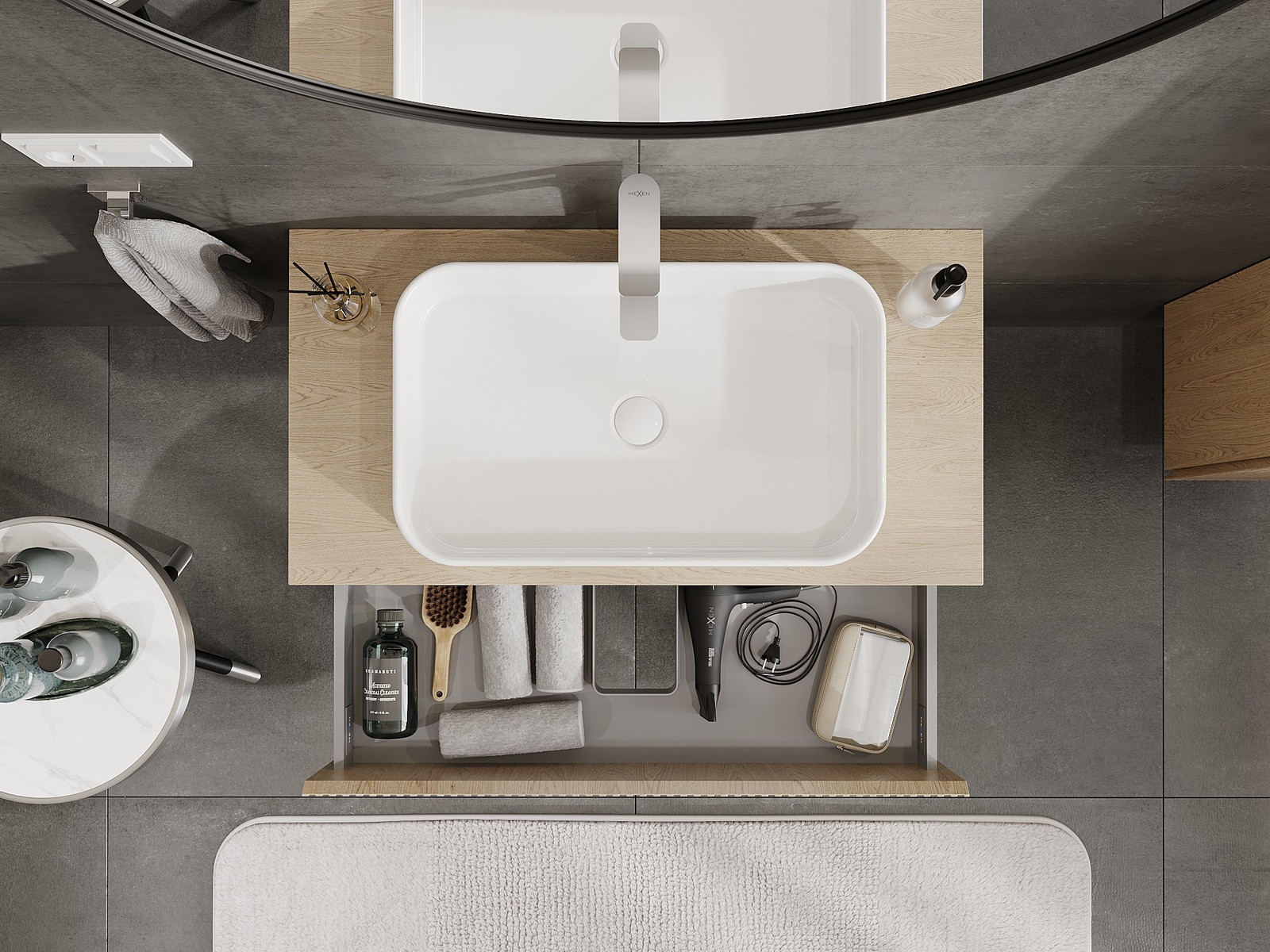 Il ritaglio nel cassetto è progettato in modo da ospitare il sifone, che è necessario nelle installazioni dei lavandini. Grazie a ciò, il mobile può essere montato in modo completamente funzionale, senza dover rinunciare allo spazio nel cassetto a favore dell'installazione.