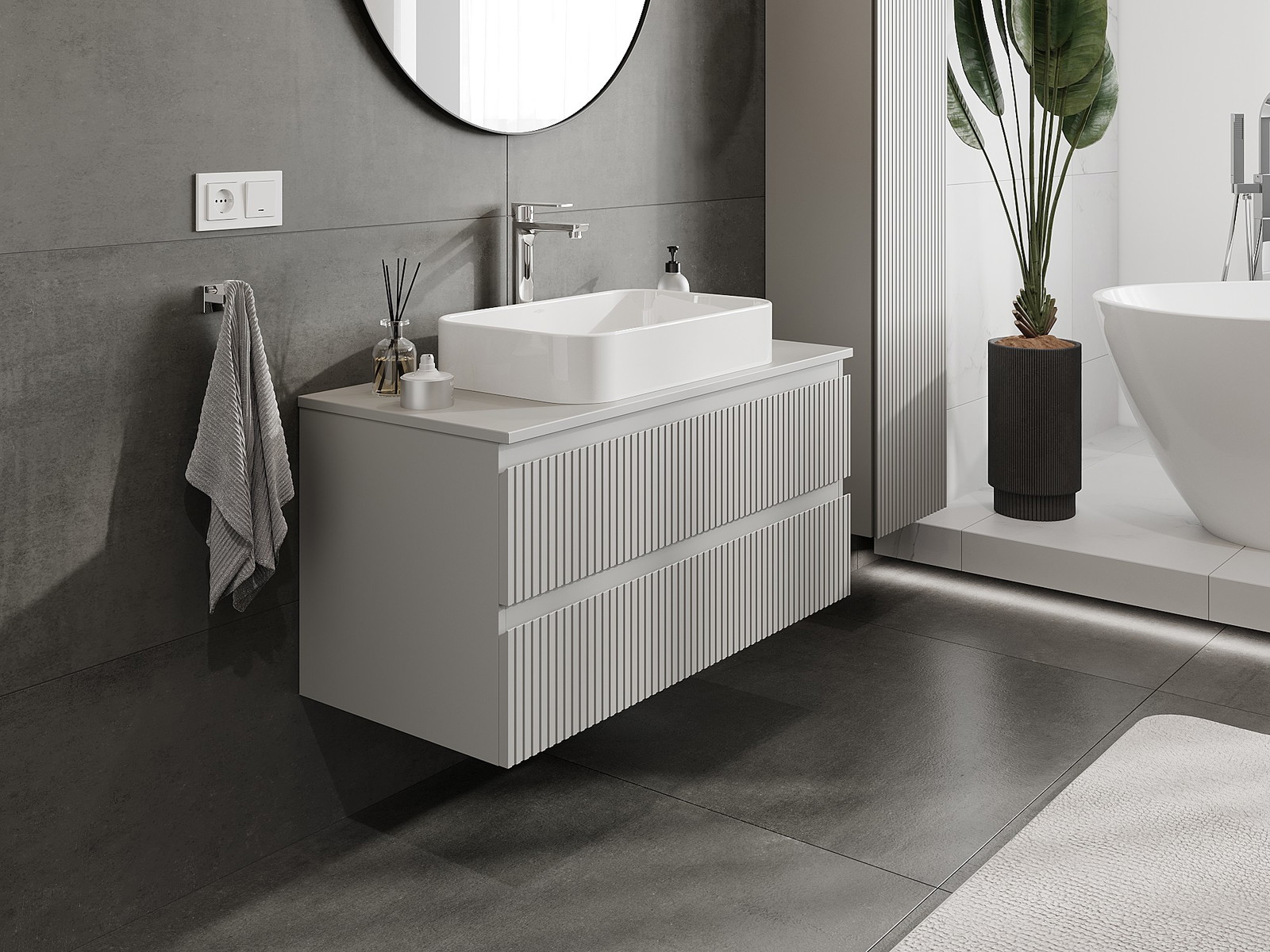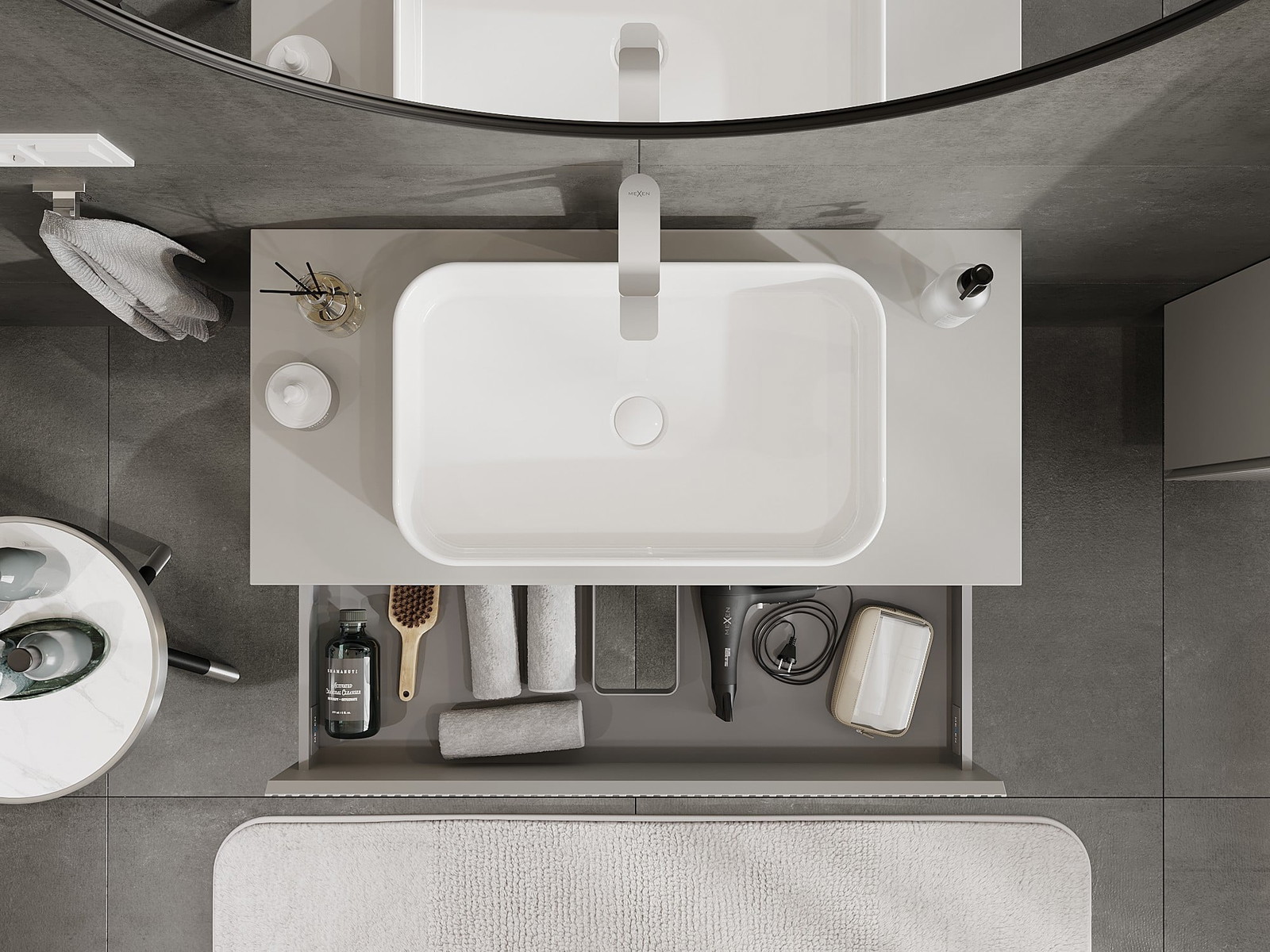 Il ritaglio nel cassetto è progettato in modo da ospitare il sifone, che è necessario nelle installazioni dei lavandini. Grazie a ciò, il mobile può essere montato in modo completamente funzionale, senza dover rinunciare allo spazio nel cassetto a favore dell'installazione.