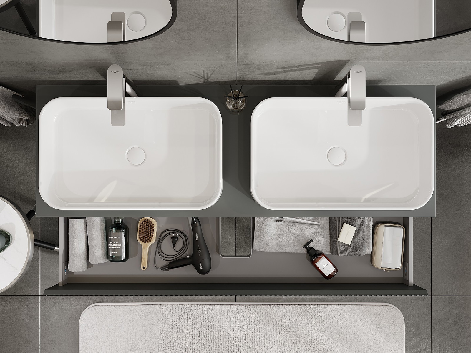 I nostri mobili da bagno modulari possono essere combinati tra loro in diverse configurazioni di colore, consentendo una personalizzazione completa. È possibile scegliere sia l'aspetto che le funzioni dei singoli elementi, permettendo di adattare i mobili alle proprie preferenze stilistiche e di utilizzo.