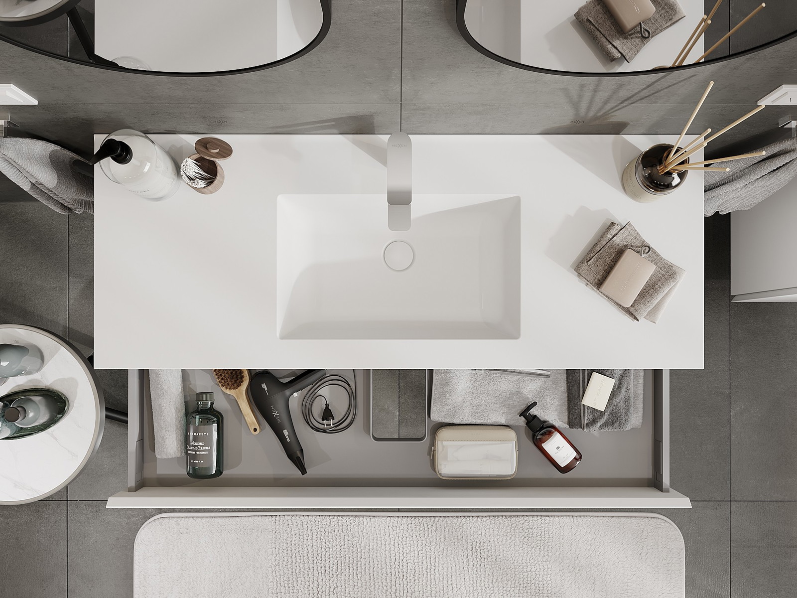 I nostri mobili da bagno modulari possono essere combinati tra loro in diverse configurazioni di colore, consentendo una personalizzazione completa. È possibile scegliere sia l'aspetto che le funzioni dei singoli elementi, permettendo di adattare i mobili alle proprie preferenze stilistiche e di utilizzo.