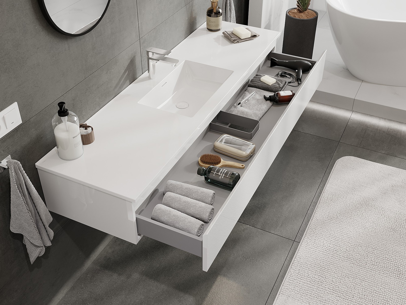 I nostri mobili da bagno modulari possono essere combinati tra loro in diverse configurazioni di colore, consentendo una personalizzazione completa. È possibile scegliere sia l'aspetto che le funzioni dei singoli elementi, permettendo di adattare i mobili alle proprie preferenze stilistiche e di utilizzo.
