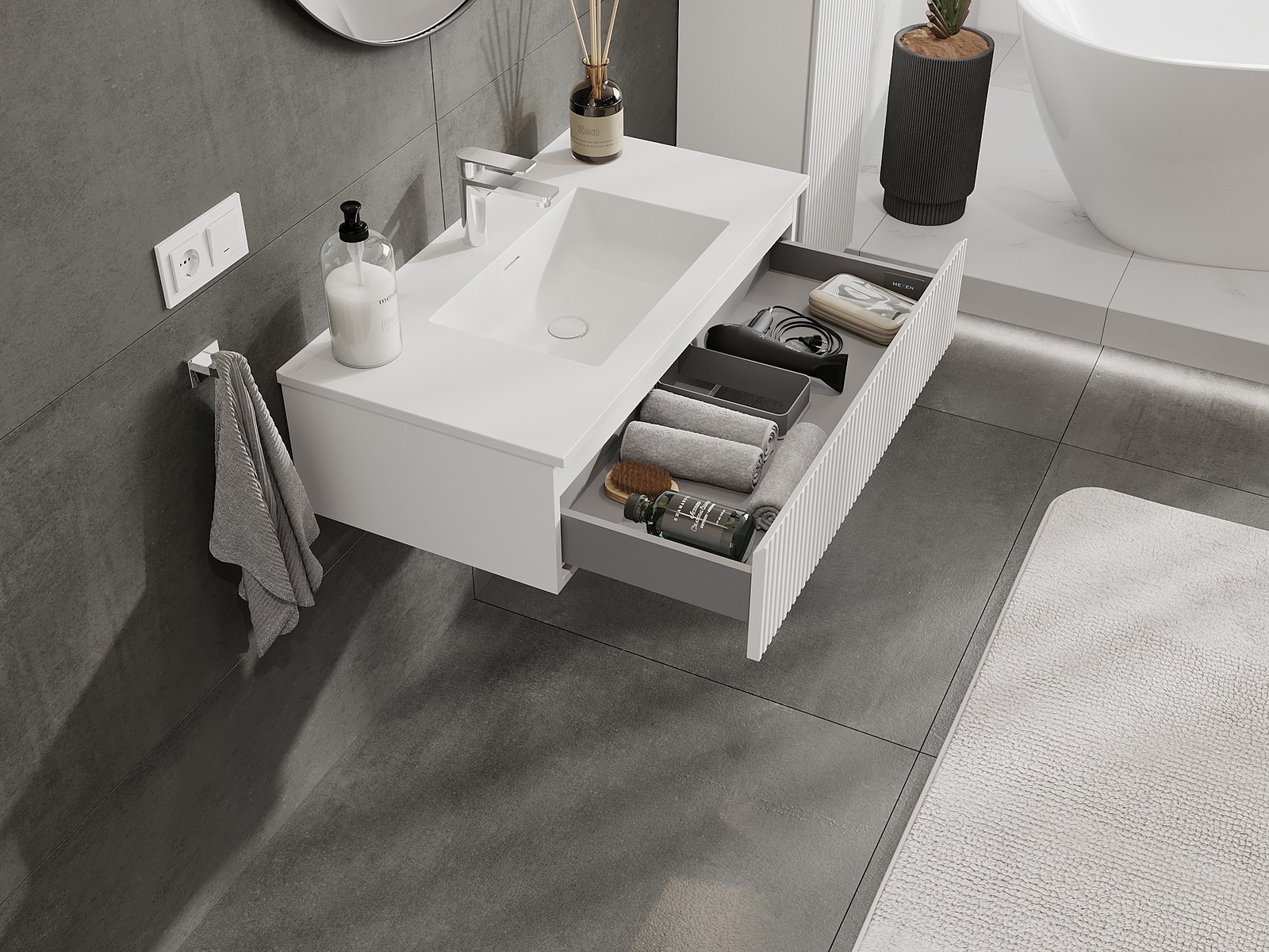 Mexen Rivel armadietto da bagno 90 cm con lavabo Otis, 1 cassetto, scanalato, bianco opaco - 91A20-09023-1-BF01-W18M01