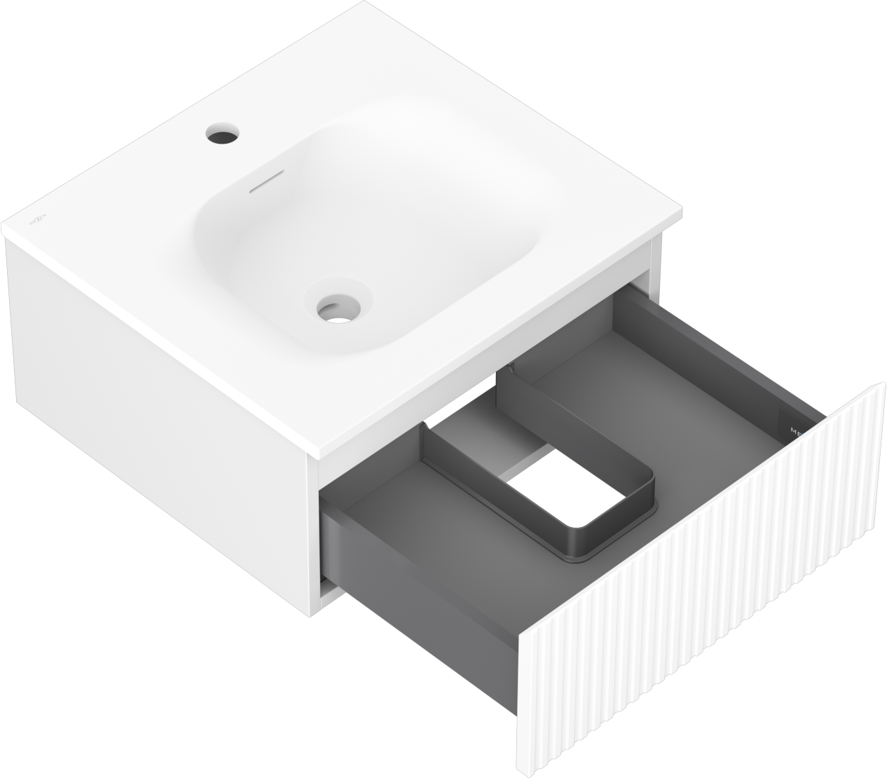 Il ritaglio nel cassetto è progettato in modo da ospitare il sifone, che è necessario nelle installazioni dei lavandini. Grazie a ciò, il mobile può essere montato in modo completamente funzionale, senza dover rinunciare allo spazio nel cassetto a favore dell'installazione.