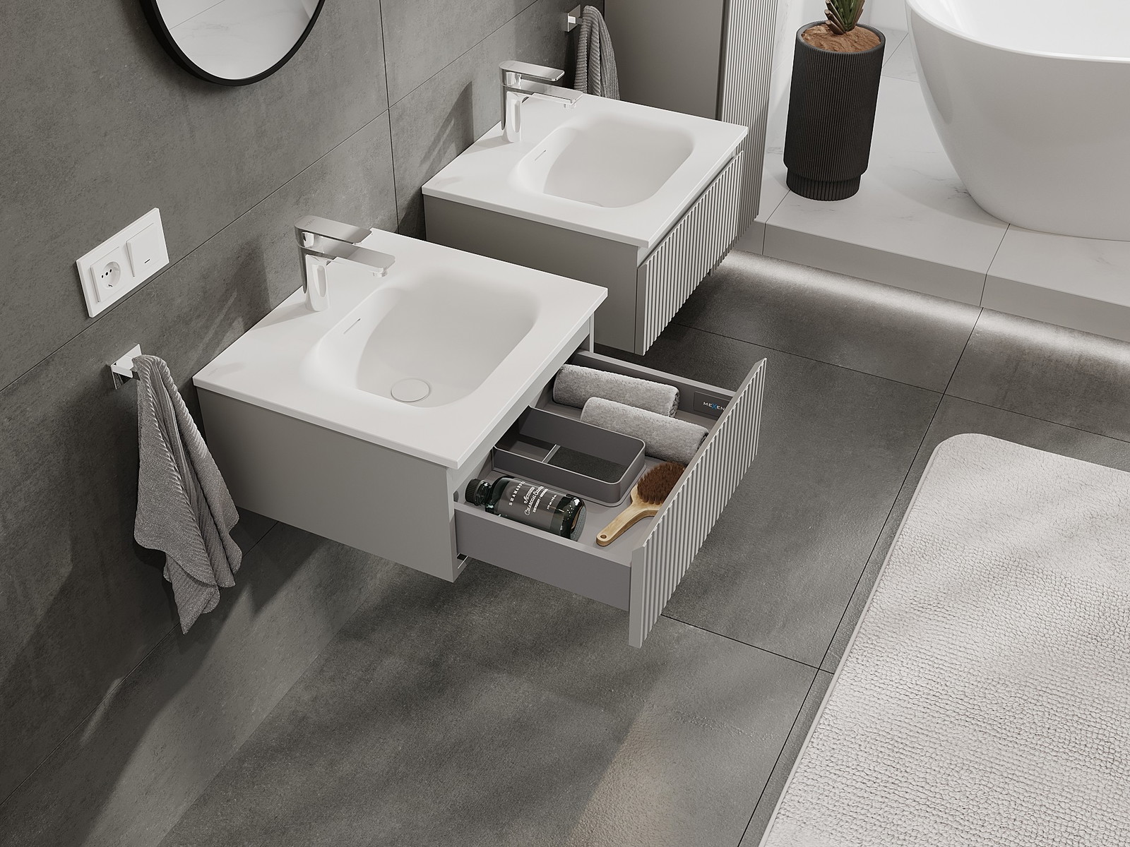 I nostri mobili da bagno modulari possono essere combinati tra loro in diverse configurazioni di colore, consentendo una personalizzazione completa. È possibile scegliere sia l'aspetto che le funzioni dei singoli elementi, permettendo di adattare i mobili alle proprie preferenze stilistiche e di utilizzo.