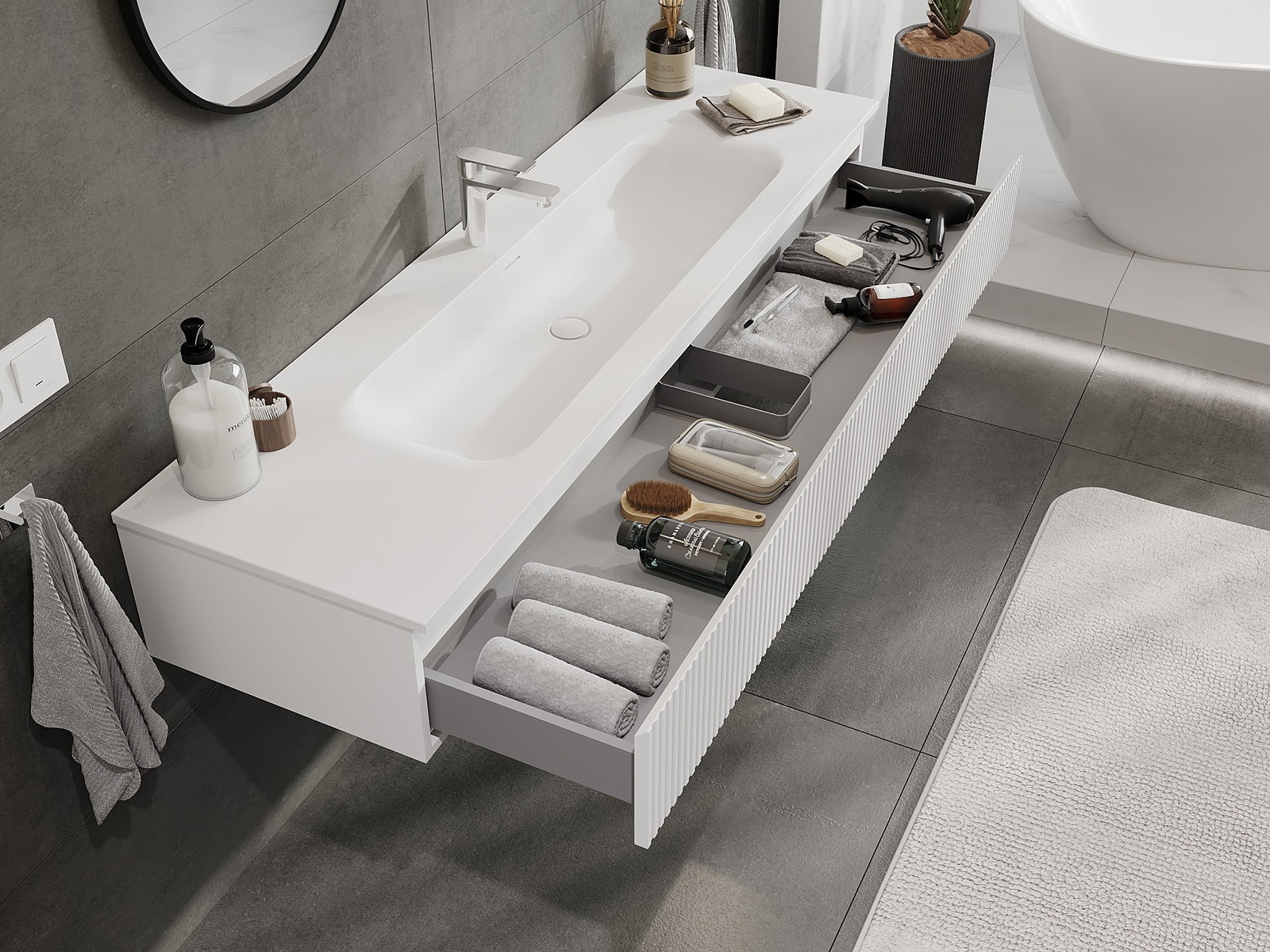 I nostri mobili da bagno modulari possono essere combinati tra loro in diverse configurazioni di colore, consentendo una personalizzazione completa. È possibile scegliere sia l'aspetto che le funzioni dei singoli elementi, permettendo di adattare i mobili alle proprie preferenze stilistiche e di utilizzo.