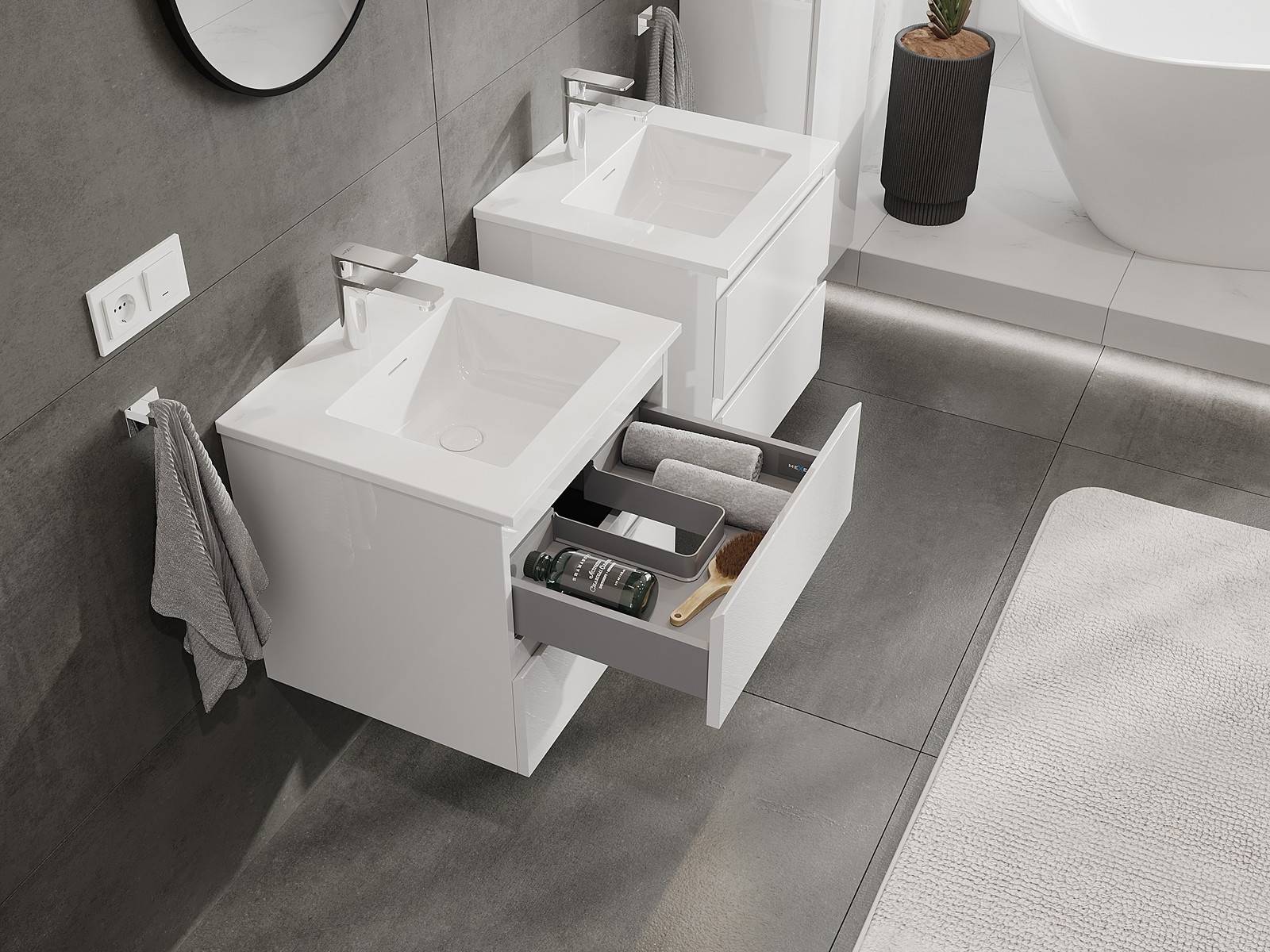 I nostri mobili da bagno modulari possono essere combinati tra loro in diverse configurazioni di colore, consentendo una personalizzazione completa. È possibile scegliere sia l'aspetto che le funzioni dei singoli elementi, permettendo di adattare i mobili alle proprie preferenze stilistiche e di utilizzo.