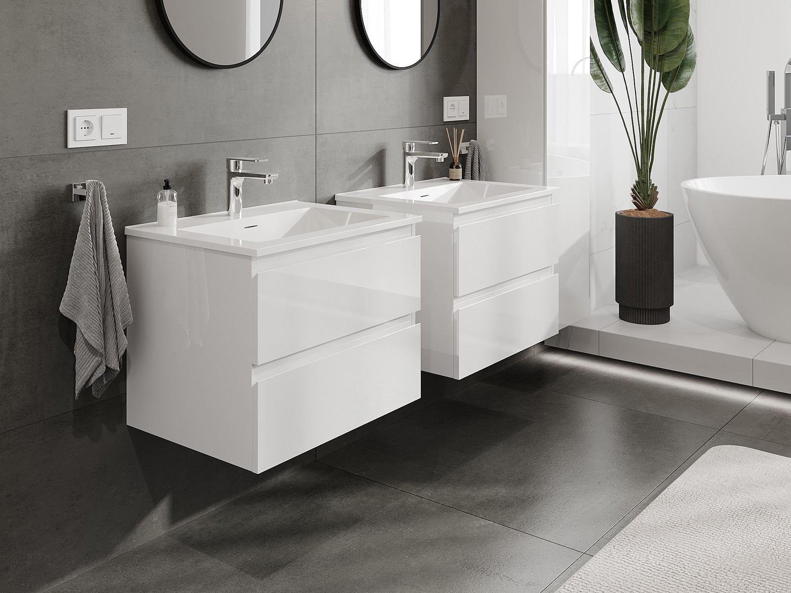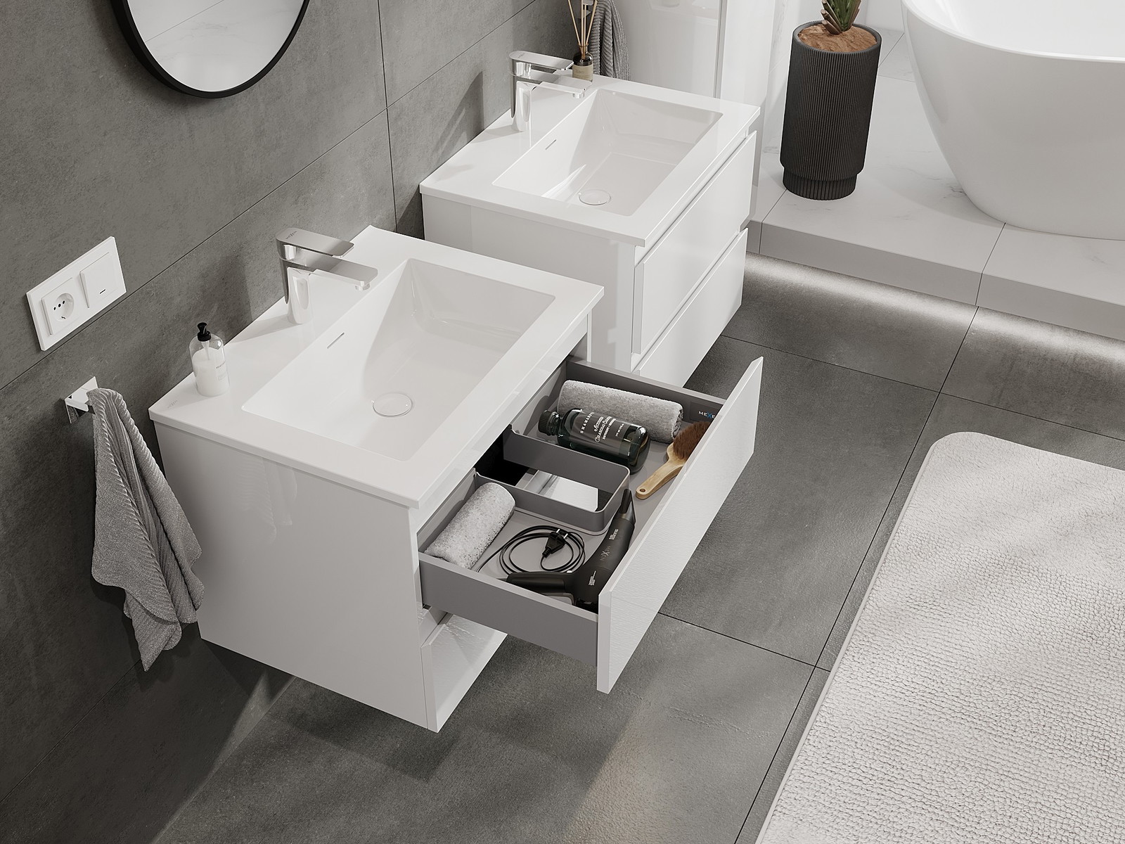 I nostri mobili da bagno modulari possono essere combinati tra loro in diverse configurazioni di colore, consentendo una personalizzazione completa. È possibile scegliere sia l'aspetto che le funzioni dei singoli elementi, permettendo di adattare i mobili alle proprie preferenze stilistiche e di utilizzo.