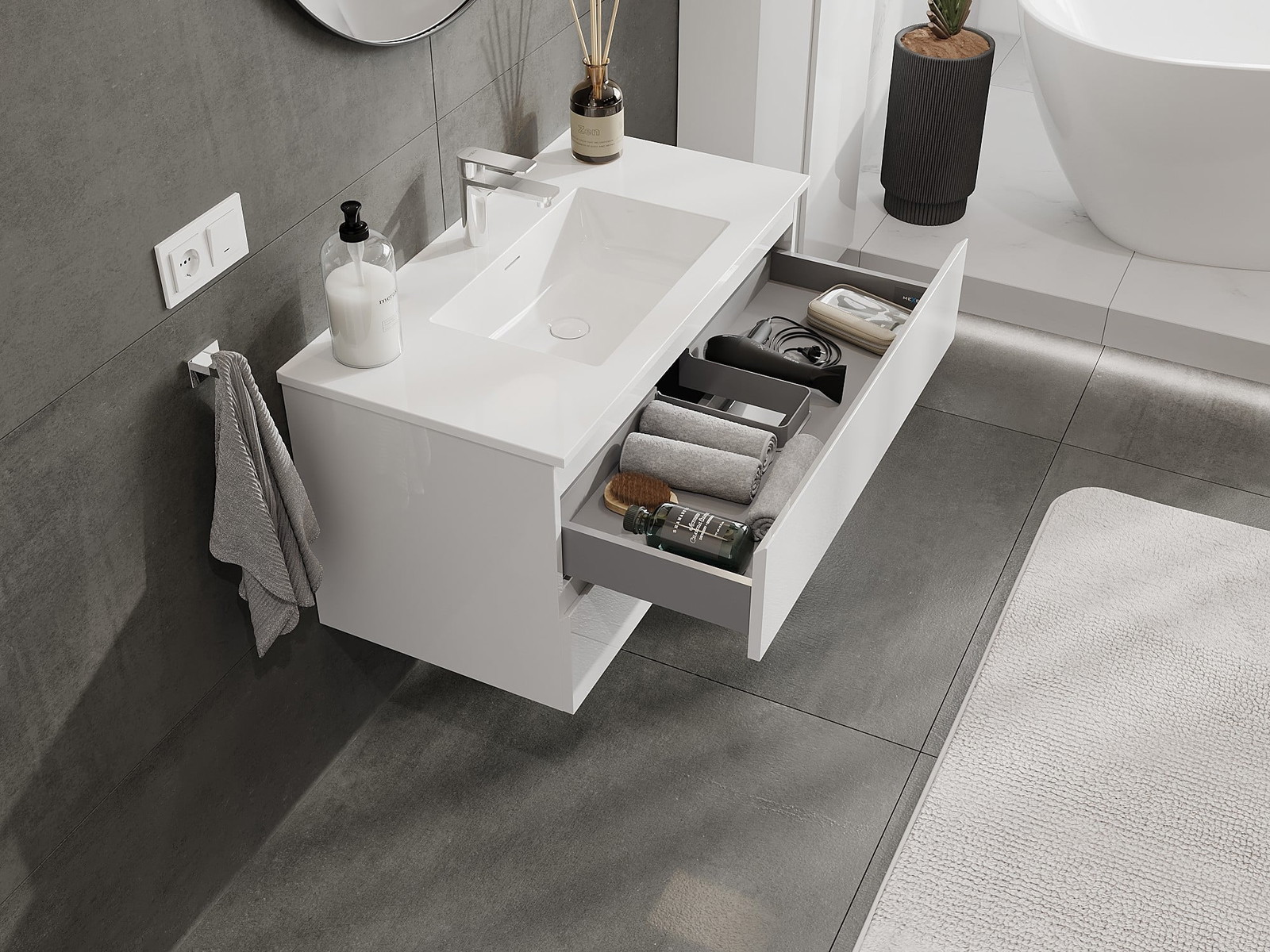 Il ritaglio nel cassetto è progettato in modo da ospitare il sifone, che è necessario nelle installazioni dei lavandini. Grazie a ciò, il mobile può essere montato in modo completamente funzionale, senza dover rinunciare allo spazio nel cassetto a favore dell'installazione.