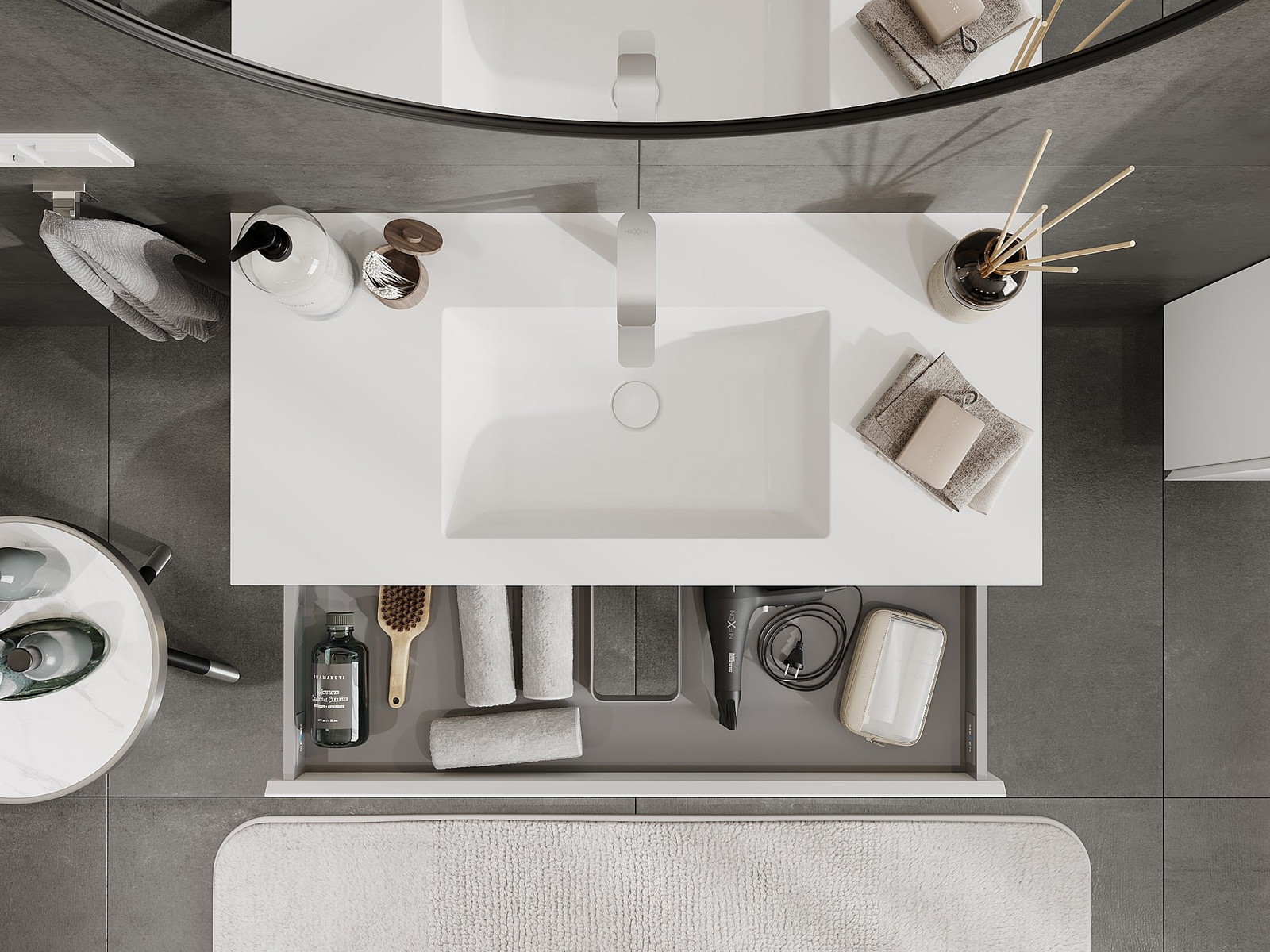 Il ritaglio nel cassetto è progettato in modo da ospitare il sifone, che è necessario nelle installazioni dei lavandini. Grazie a ciò, il mobile può essere montato in modo completamente funzionale, senza dover rinunciare allo spazio nel cassetto a favore dell'installazione.