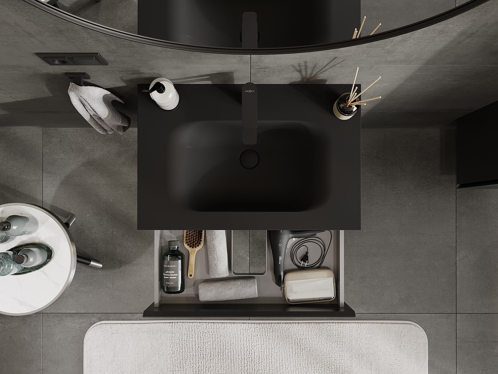 Il ritaglio nel cassetto è progettato in modo da ospitare il sifone, che è necessario nelle installazioni dei lavandini. Grazie a ciò, il mobile può essere montato in modo completamente funzionale, senza dover rinunciare allo spazio nel cassetto a favore dell'installazione.