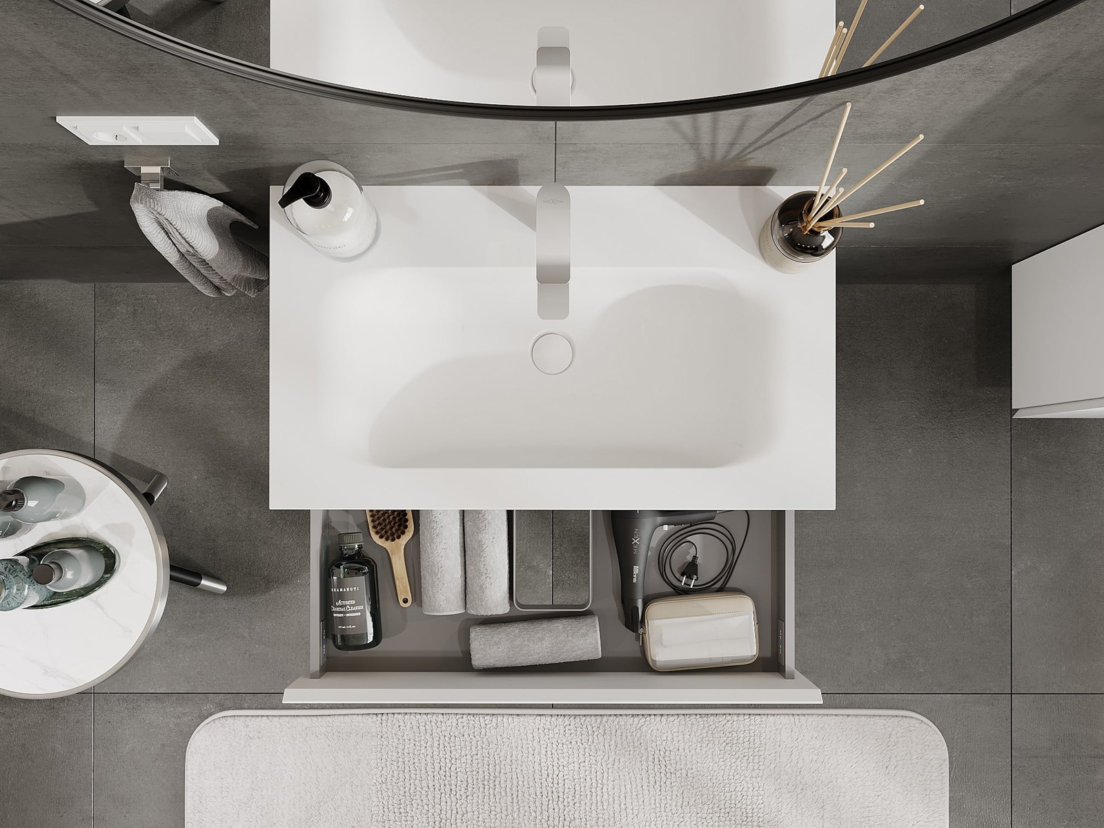 Il ritaglio nel cassetto è progettato in modo da ospitare il sifone, che è necessario nelle installazioni dei lavandini. Grazie a ciò, il mobile può essere montato in modo completamente funzionale, senza dover rinunciare allo spazio nel cassetto a favore dell'installazione.