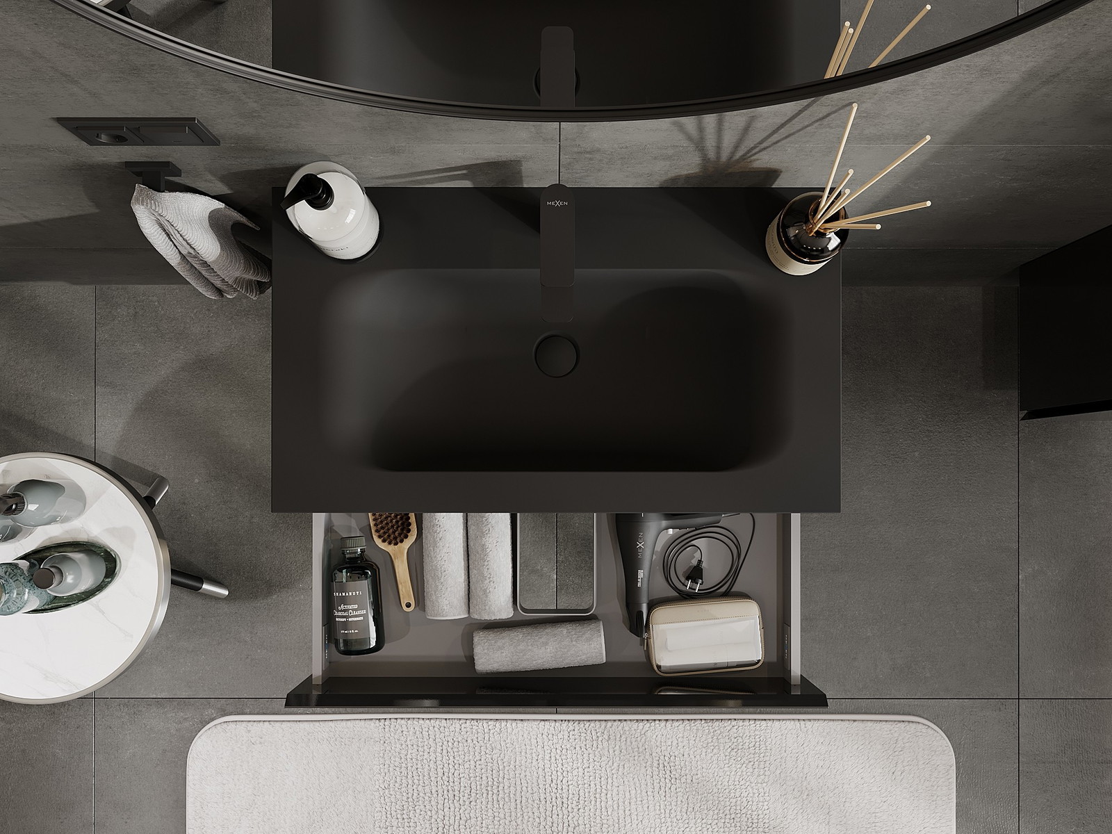 Il ritaglio nel cassetto è progettato in modo da ospitare il sifone, che è necessario nelle installazioni dei lavandini. Grazie a ciò, il mobile può essere montato in modo completamente funzionale, senza dover rinunciare allo spazio nel cassetto a favore dell'installazione.