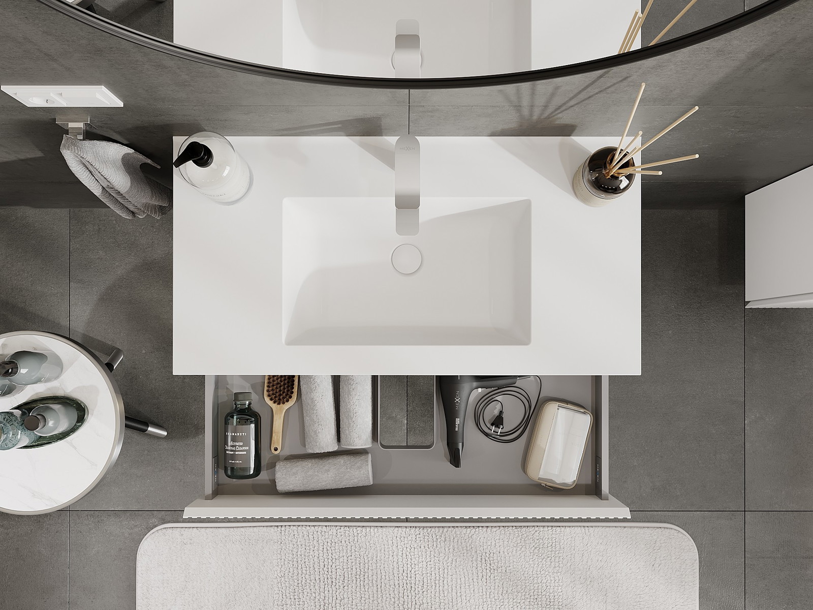 Il ritaglio nel cassetto è progettato in modo da ospitare il sifone, che è necessario nelle installazioni dei lavandini. Grazie a ciò, il mobile può essere montato in modo completamente funzionale, senza dover rinunciare allo spazio nel cassetto a favore dell'installazione.