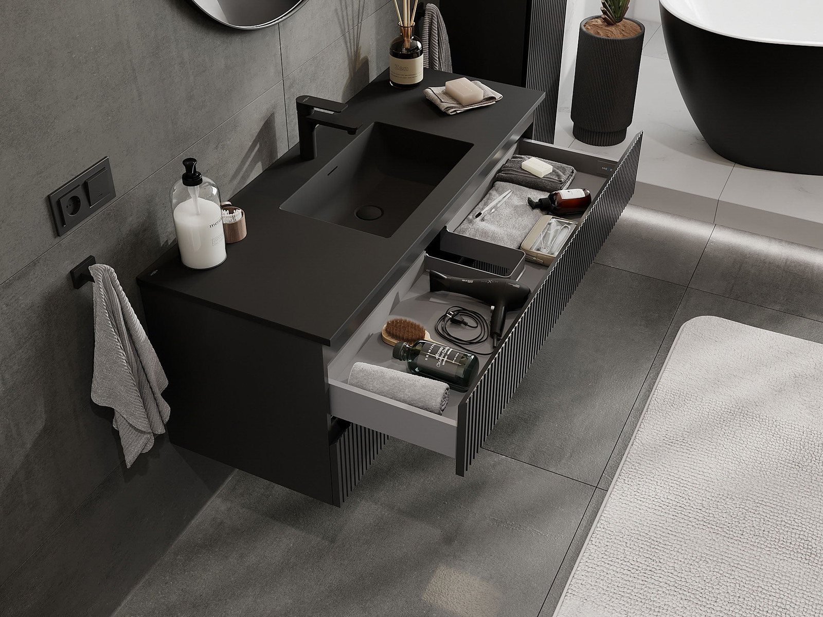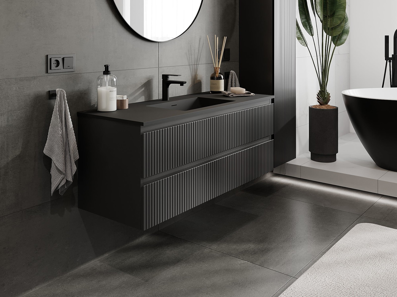 Mexen Rivel armadietto bagno 120 cm con lavabo Otis, 2 cassetti, scanalato, nero opaco - 91A20-12047-2-BFF71-W18M71
