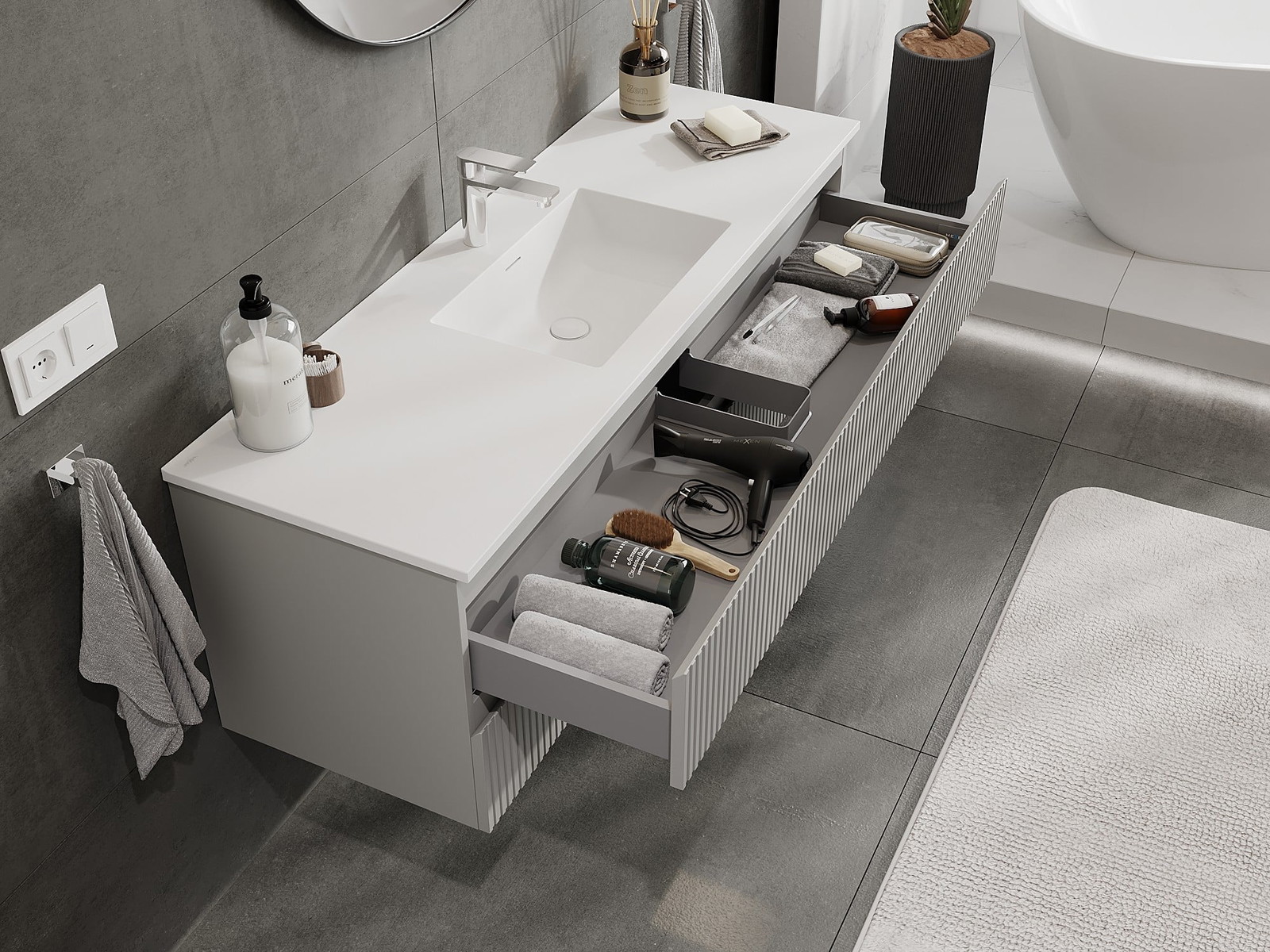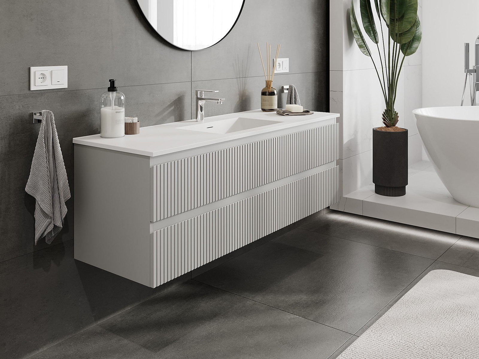 Mexen Rivel armadietto da bagno 140 cm con lavabo Otis, 2 cassetti, scanalato, grigio opaco/bianco opaco -