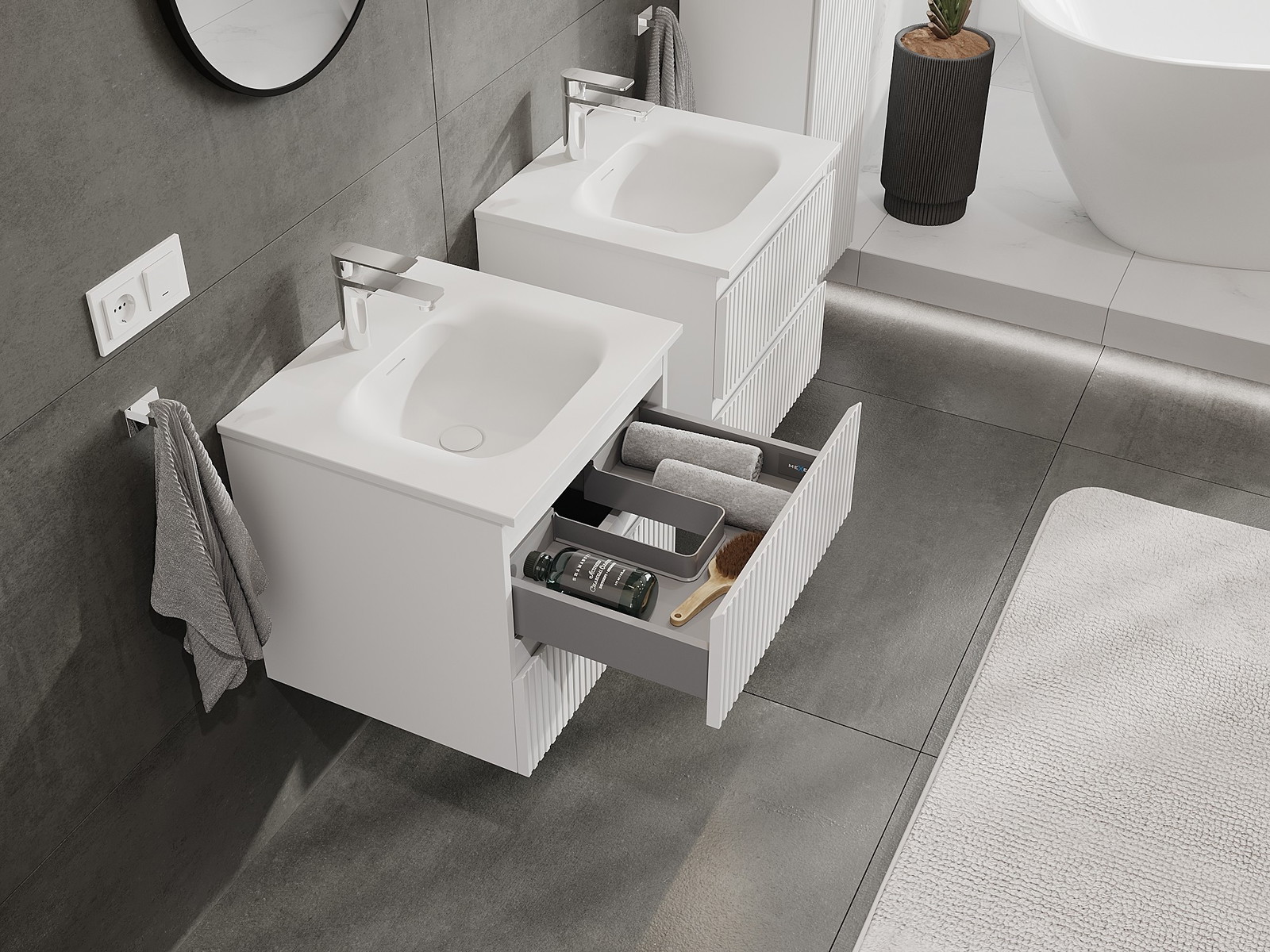Il ritaglio nel cassetto è progettato in modo da ospitare il sifone, che è necessario nelle installazioni dei lavandini. Grazie a ciò, il mobile può essere montato in modo completamente funzionale, senza dover rinunciare allo spazio nel cassetto a favore dell'installazione.