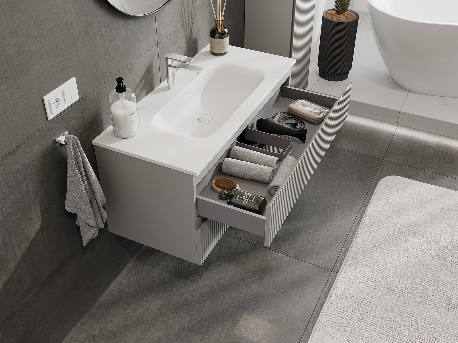 Il ritaglio nel cassetto è progettato in modo da ospitare il sifone, che è necessario nelle installazioni dei lavandini. Grazie a ciò, il mobile può essere montato in modo completamente funzionale, senza dover rinunciare allo spazio nel cassetto a favore dell'installazione.
