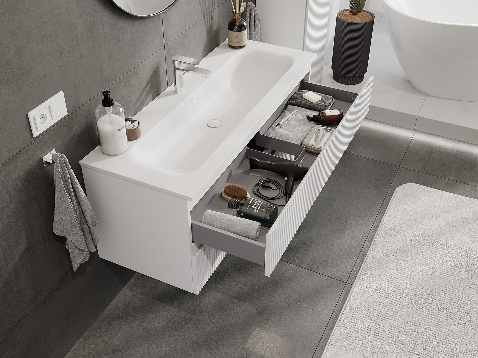 Il ritaglio nel cassetto è progettato in modo da ospitare il sifone, che è necessario nelle installazioni dei lavandini. Grazie a ciò, il mobile può essere montato in modo completamente funzionale, senza dover rinunciare allo spazio nel cassetto a favore dell'installazione.