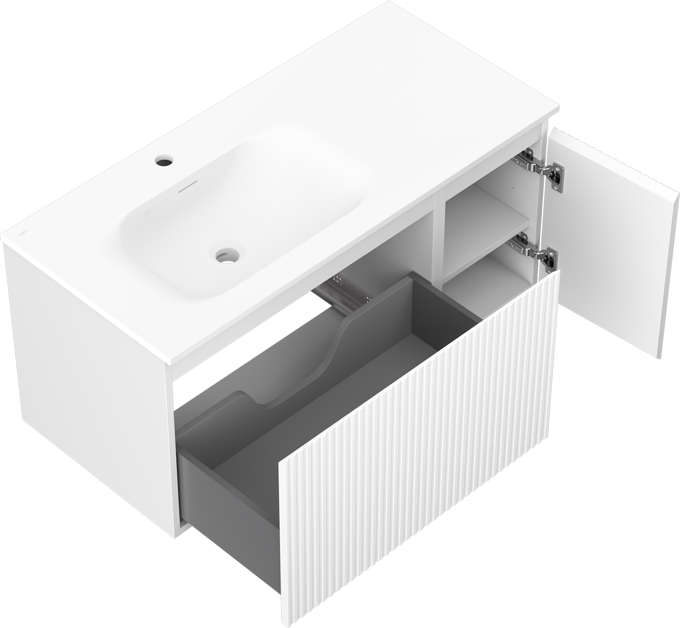 Il ritaglio nel cassetto è progettato in modo da ospitare il sifone, che è necessario nelle installazioni dei lavandini. Grazie a ciò, il mobile può essere montato in modo completamente funzionale, senza dover rinunciare allo spazio nel cassetto a favore dell'installazione.