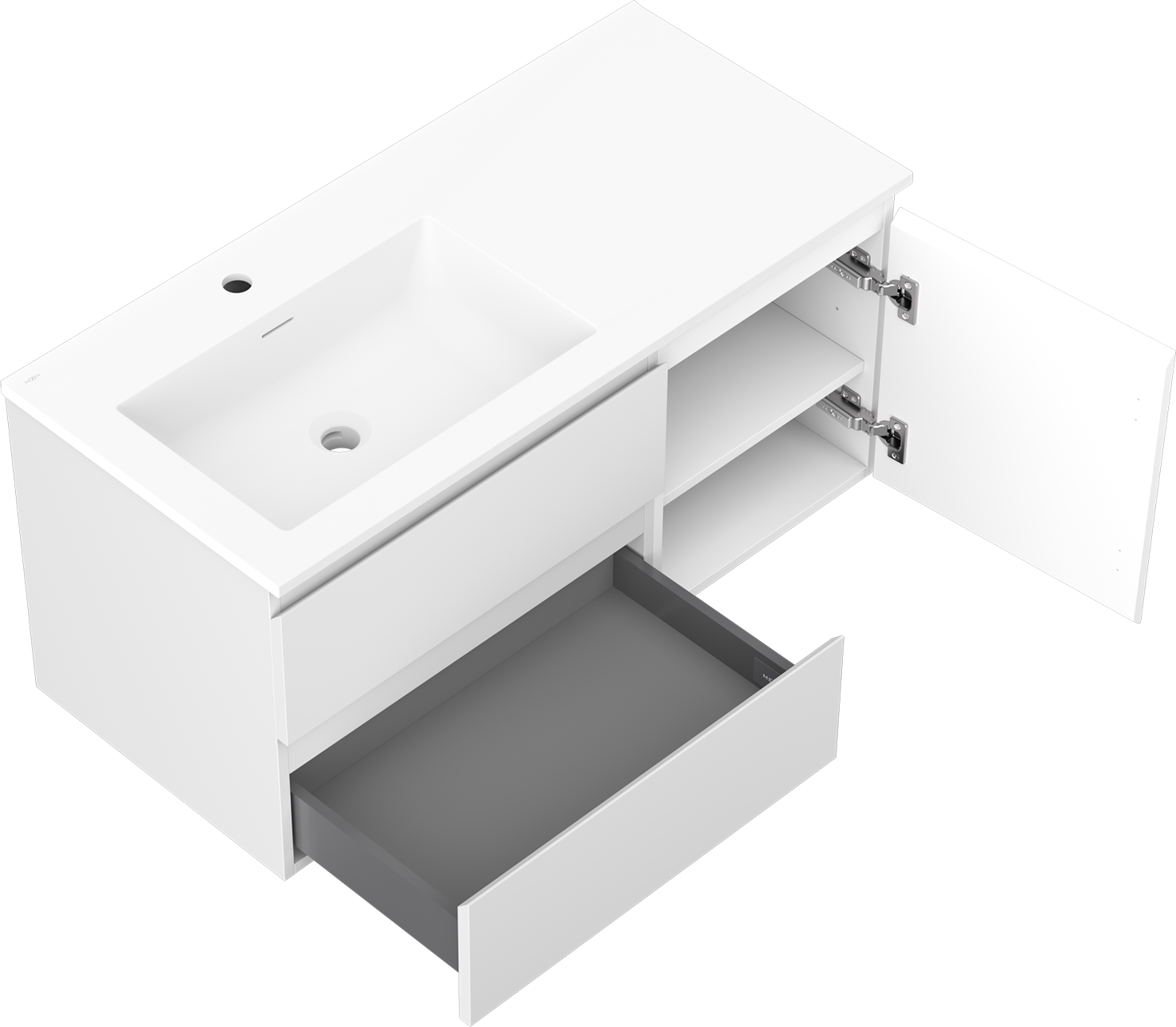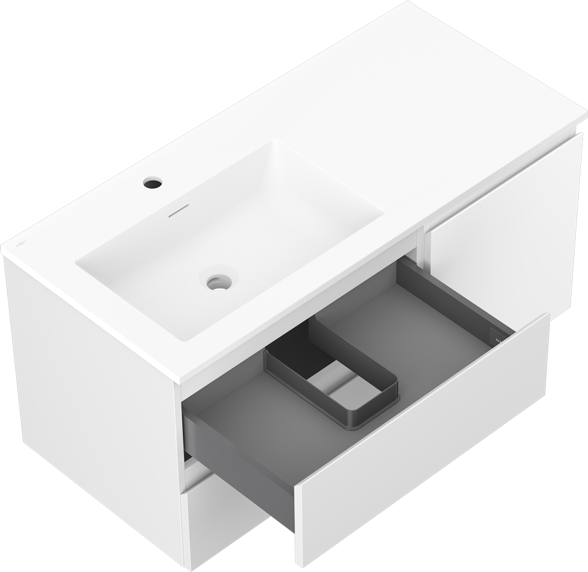 Il ritaglio nel cassetto è progettato in modo da ospitare il sifone, che è necessario nelle installazioni dei lavandini. Grazie a ciò, il mobile può essere montato in modo completamente funzionale, senza dover rinunciare allo spazio nel cassetto a favore dell'installazione.