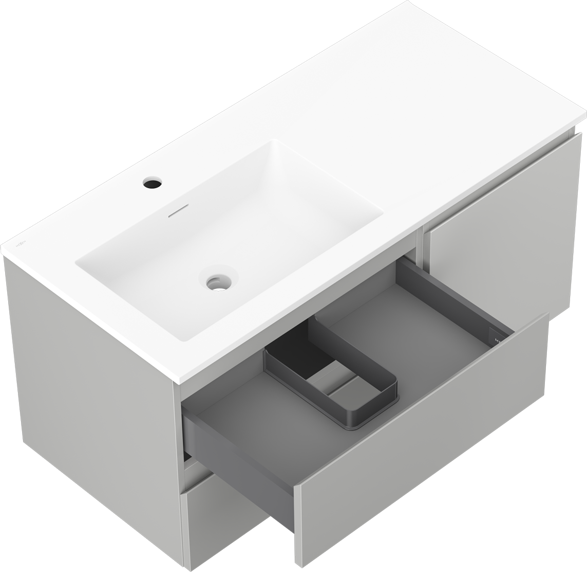 Il ritaglio nel cassetto è progettato in modo da ospitare il sifone, che è necessario nelle installazioni dei lavandini. Grazie a ciò, il mobile può essere montato in modo completamente funzionale, senza dover rinunciare allo spazio nel cassetto a favore dell'installazione.