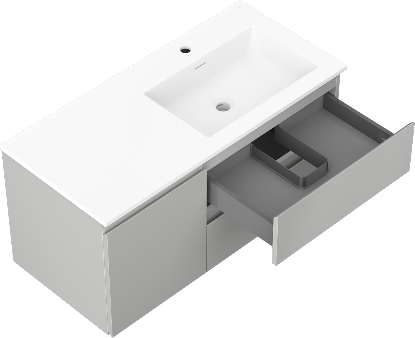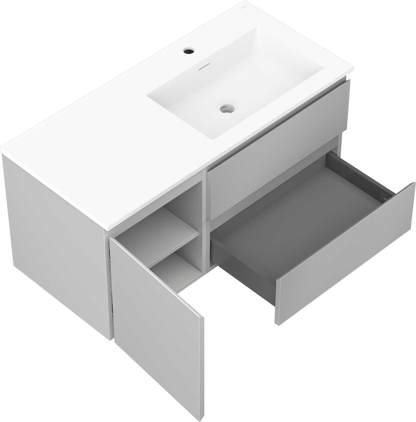 Il ritaglio nel cassetto è progettato in modo da ospitare il sifone, che è necessario nelle installazioni dei lavandini. Grazie a ciò, il mobile può essere montato in modo completamente funzionale, senza dover rinunciare allo spazio nel cassetto a favore dell'installazione.