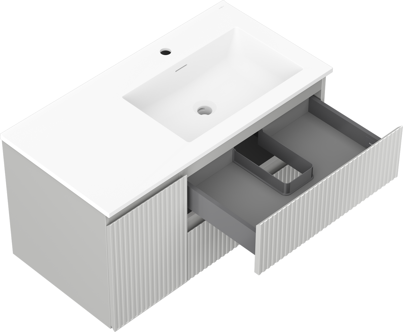 Il ritaglio nel cassetto è progettato in modo da ospitare il sifone, che è necessario nelle installazioni dei lavandini. Grazie a ciò, il mobile può essere montato in modo completamente funzionale, senza dover rinunciare allo spazio nel cassetto a favore dell'installazione.