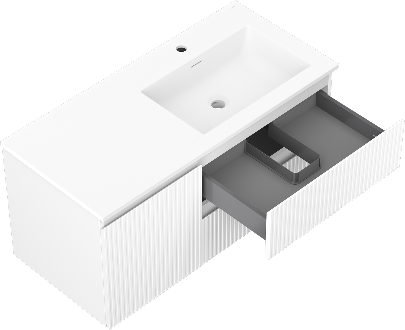 Il ritaglio nel cassetto è progettato in modo da ospitare il sifone, che è necessario nelle installazioni dei lavandini. Grazie a ciò, il mobile può essere montato in modo completamente funzionale, senza dover rinunciare allo spazio nel cassetto a favore dell'installazione.