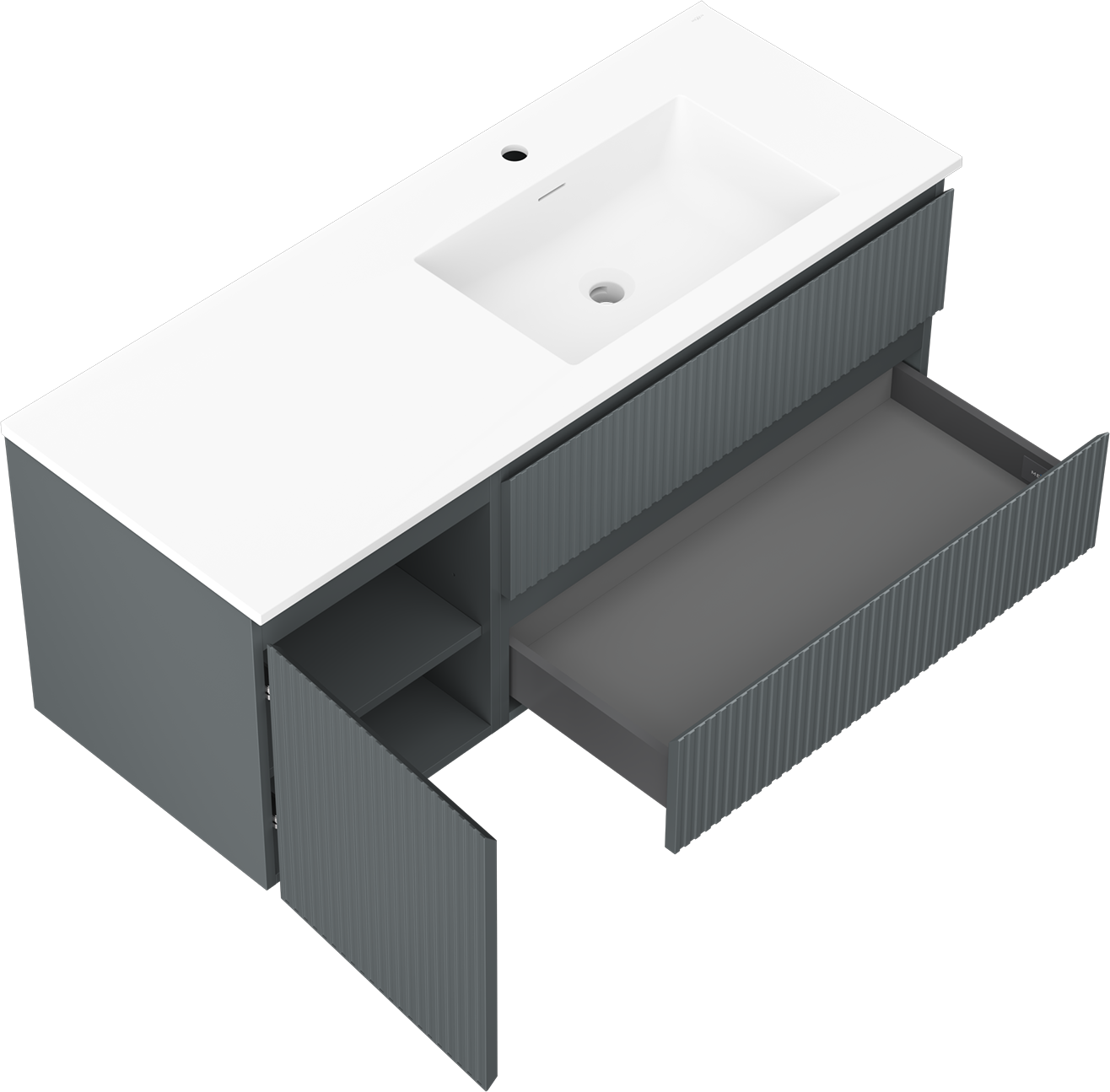Il ritaglio nel cassetto è progettato in modo da ospitare il sifone, che è necessario nelle installazioni dei lavandini. Grazie a ciò, il mobile può essere montato in modo completamente funzionale, senza dover rinunciare allo spazio nel cassetto a favore dell'installazione.
