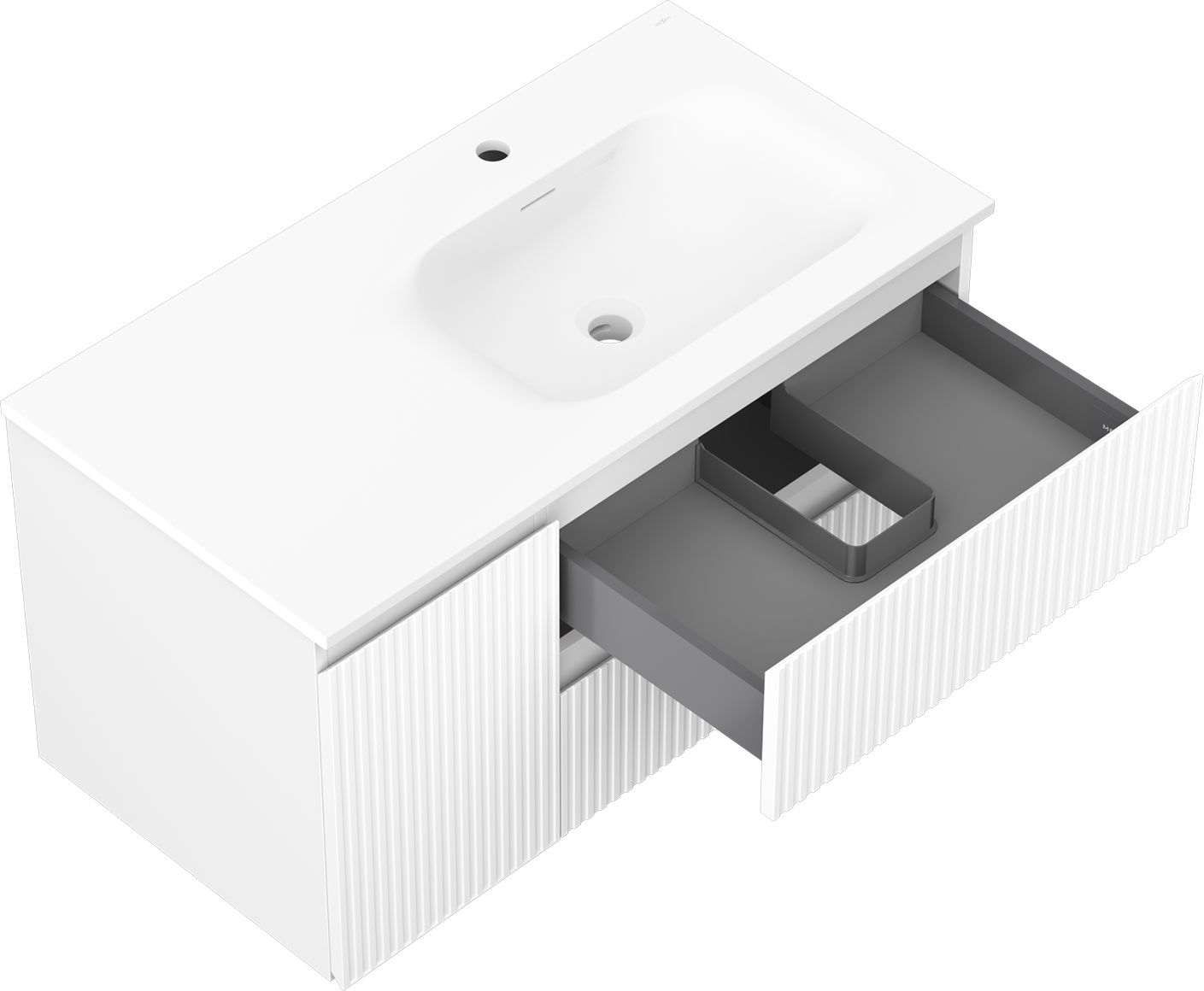 Il ritaglio nel cassetto è progettato in modo da ospitare il sifone, che è necessario nelle installazioni dei lavandini. Grazie a ciò, il mobile può essere montato in modo completamente funzionale, senza dover rinunciare allo spazio nel cassetto a favore dell'installazione.