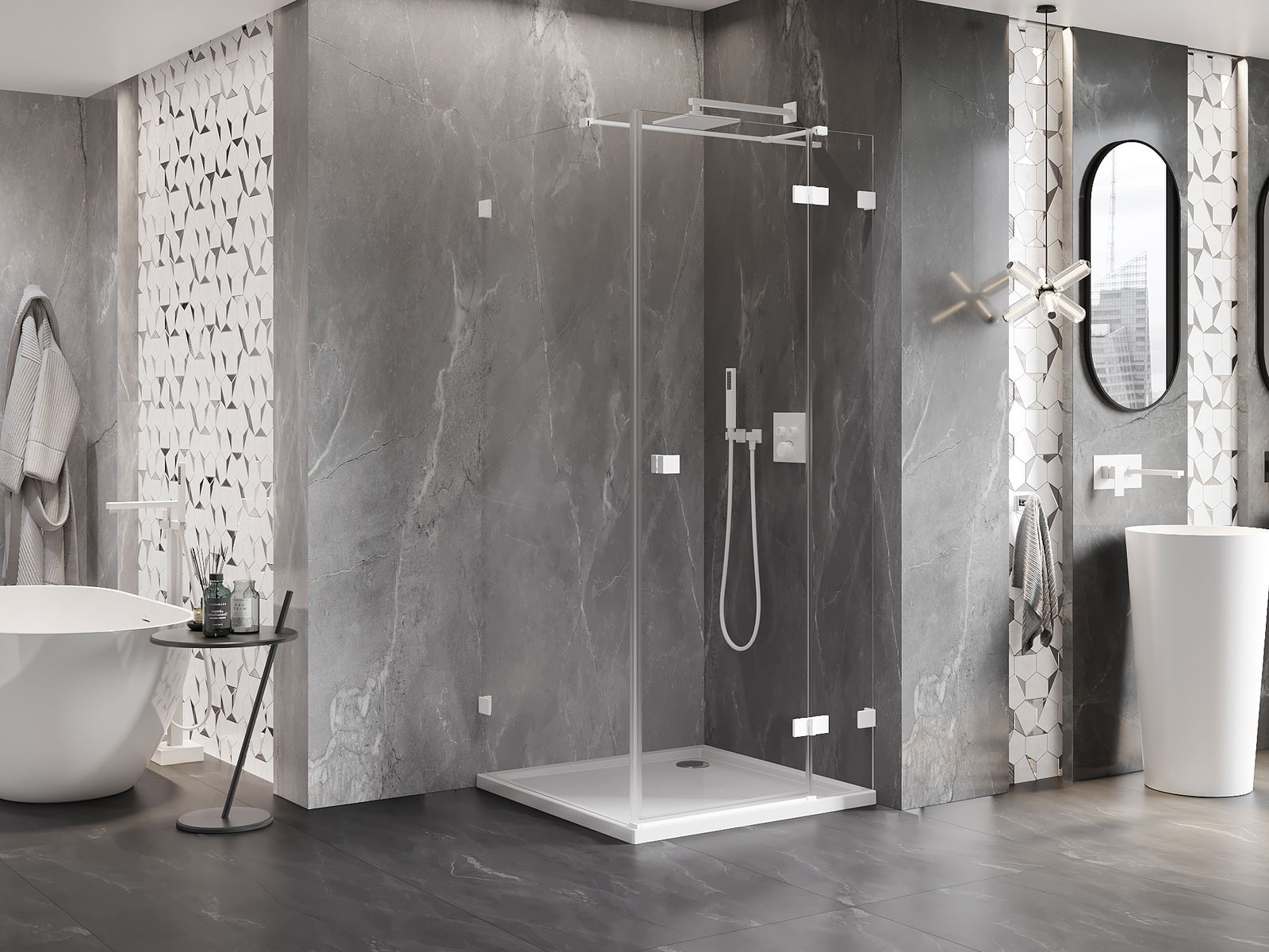 L'impugnatura pratica e comoda è realizzata in metallo durevole e resistente. La forma alla moda combinata con una finitura abbinata al colore dei profili conferisce all'insieme un aspetto moderno e elegante, enfatizzando l'estetica di ogni bagno.