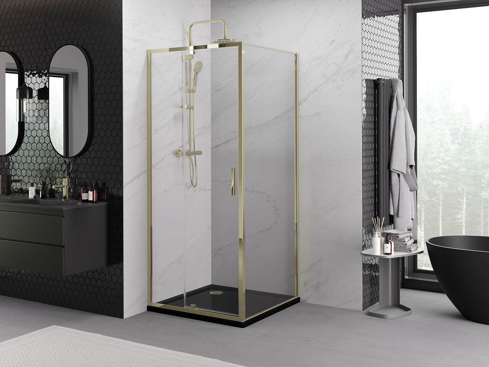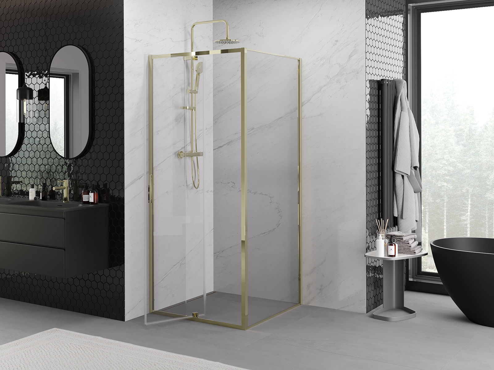 Il prodotto, a seconda delle esigenze, può essere installato sia sul piatto doccia che direttamente sul pavimento. Il metodo di installazione universale consente di adattare il prodotto a diversi tipi di bagni e configurazioni di spazio.