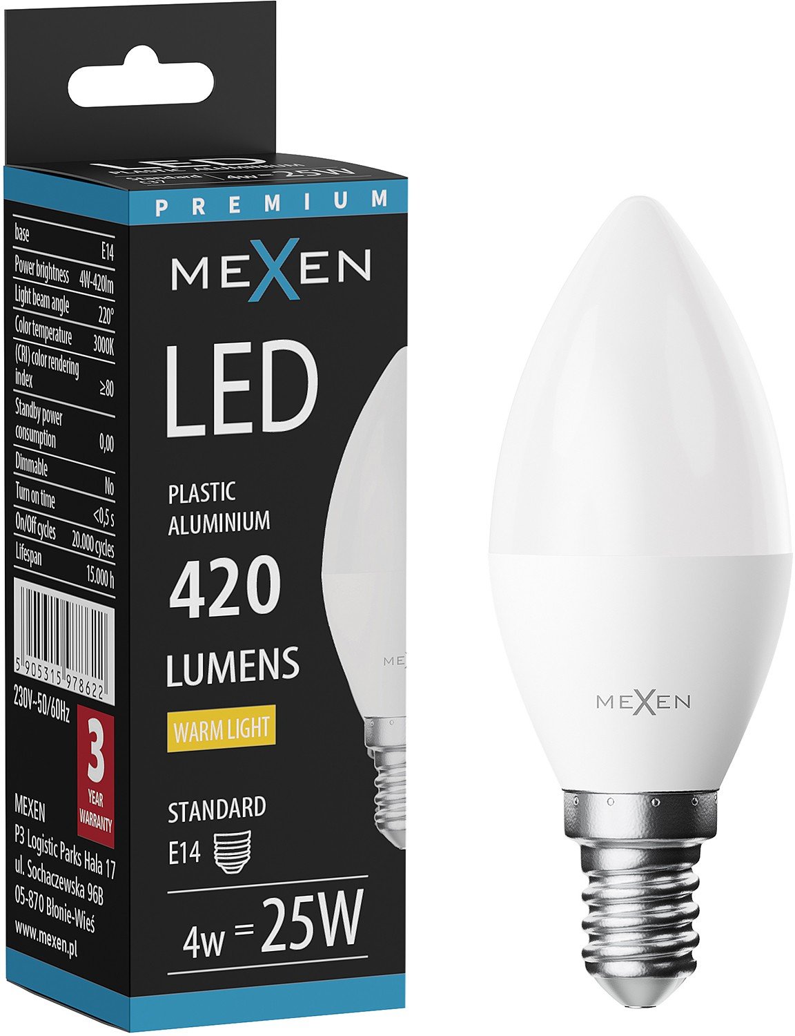 Mexen Nova Lampadina LED E14, C37, 4W, Calda - 3000K, 420 lm - L102-E14-0430-01
