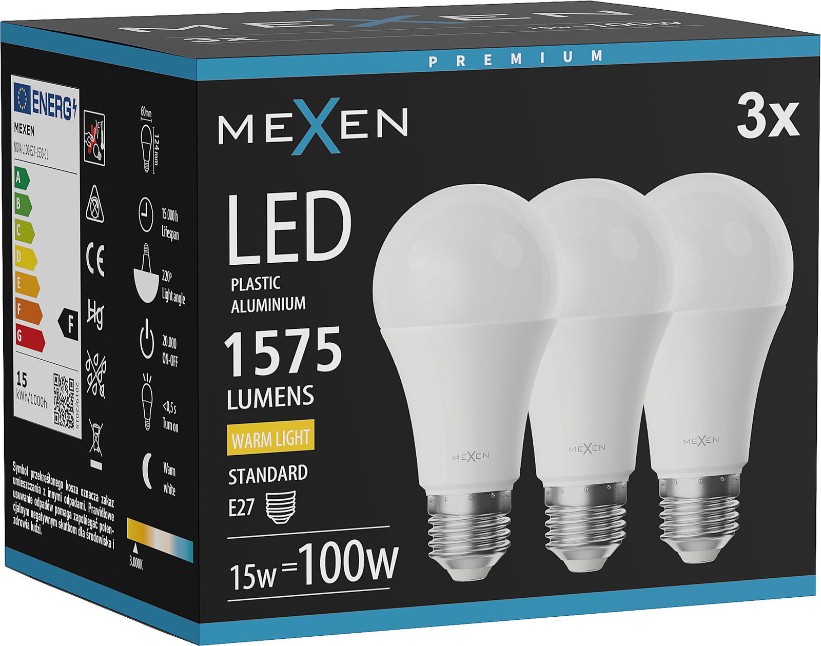 Mexen Nova 3x Lampadina LED E27, A60, 15W, Calda - 3000K, 1575 lm - L100-E27-1530-01x03
