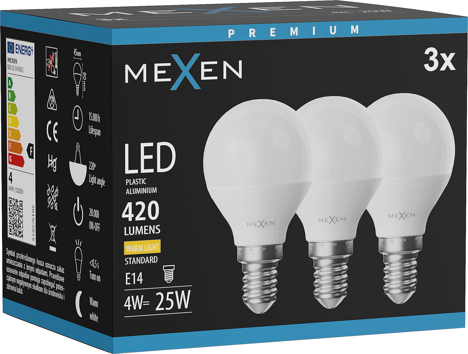 Mexen Nova 3x Lampadina LED E14, G45, 4W, Calda - 3000K, 420 lm - L101-E14-0430-01x03
